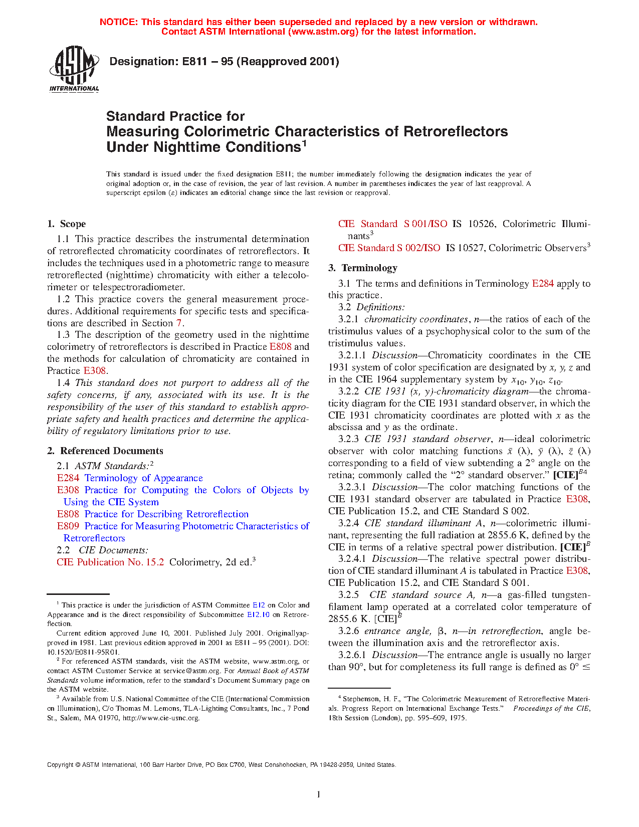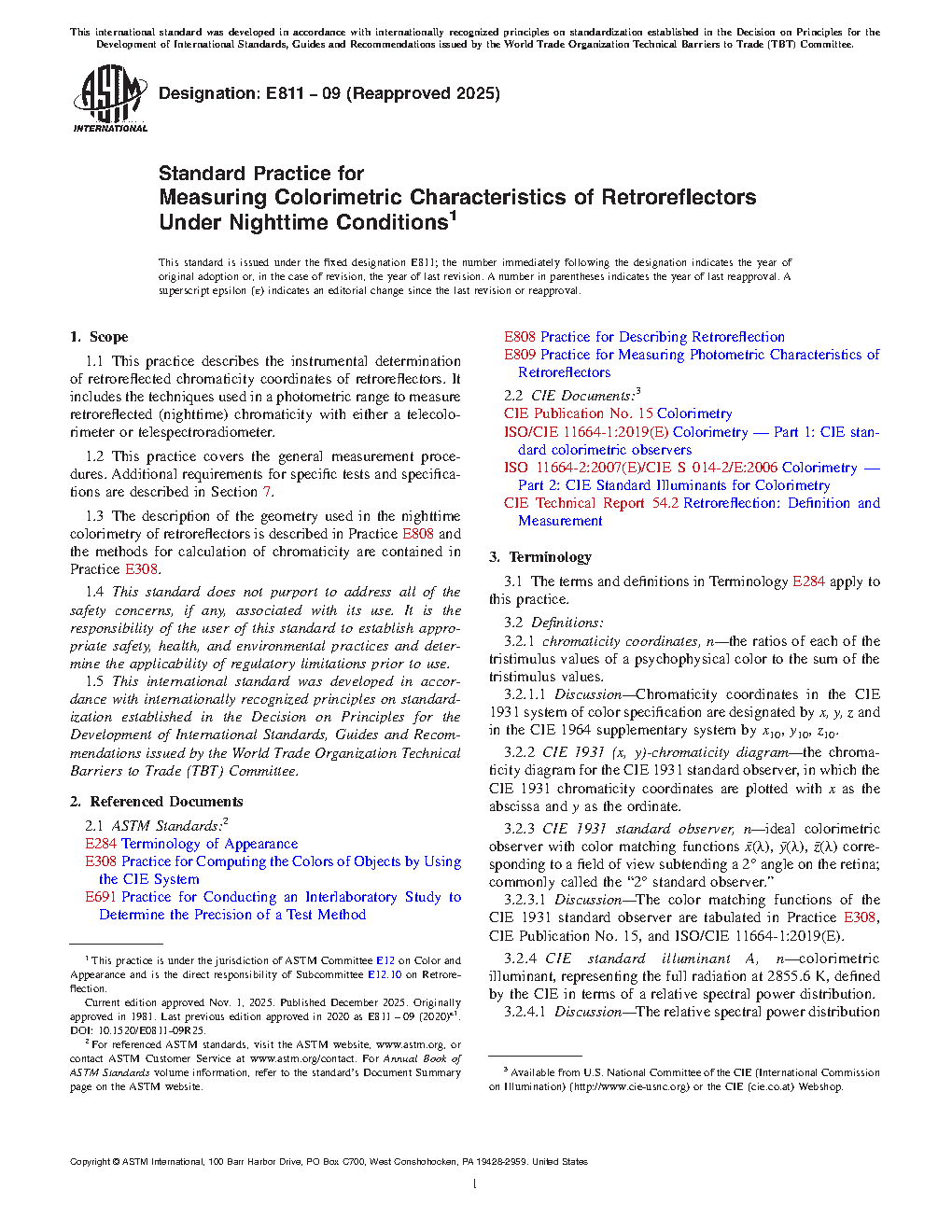 1.3 The description of the geometry used in the nighttime colorimetry of retroreflectors is described in Practice E808 and the methods for calculation of chromaticity are contained in Practice E308.