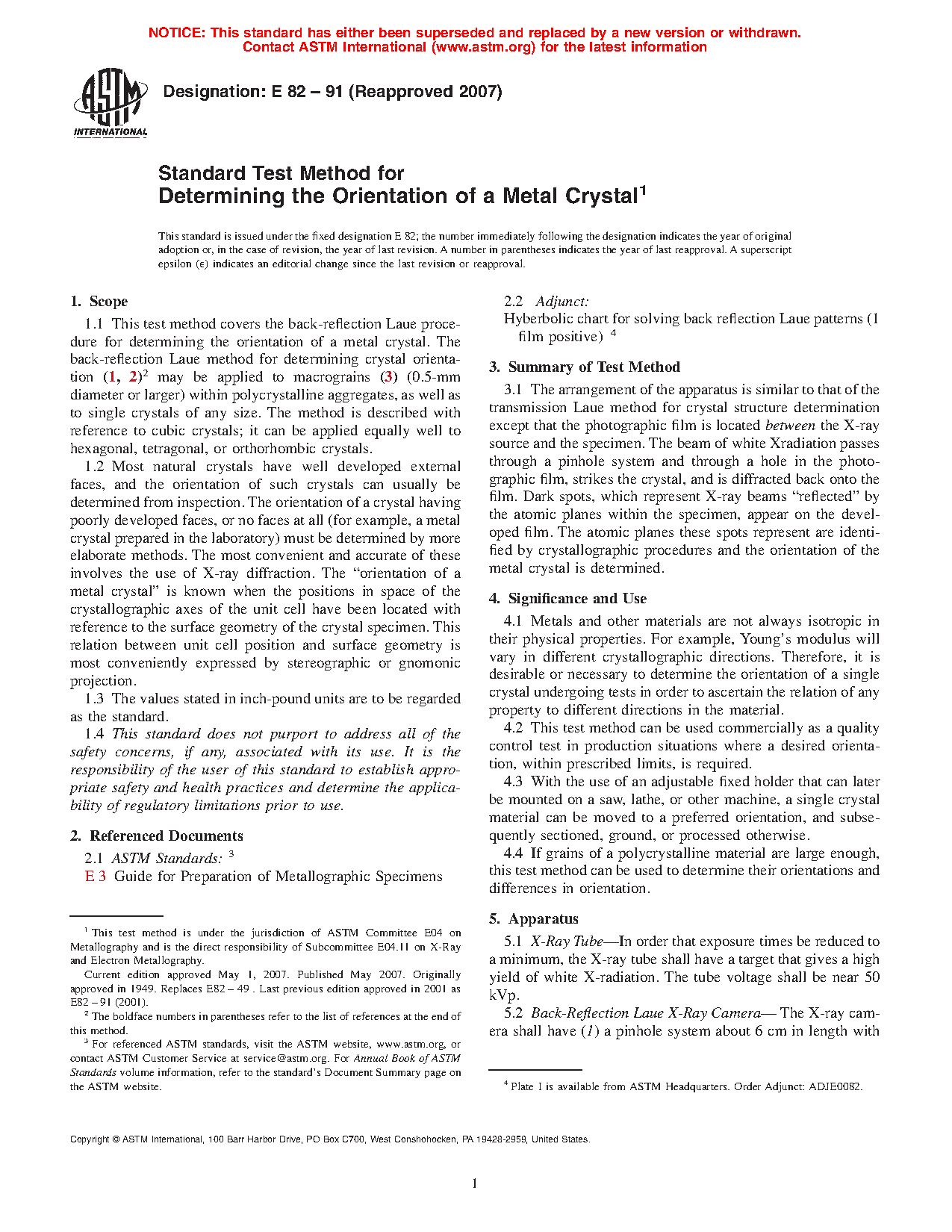 1.1 This test method covers the back-reflection Laue procedure for determining the orientation of a metal crystal. The back-reflection Laue method for determining crystal orientation (1, 2) may be applied to macrograins (3) (0.5-mm diameter or larger) within polycrystalline aggregates, as well as to single crystals of any size. The method is described with reference to cubic crystals; it can be applied equally well to hexagonal, tetragonal, or orthorhombic crystals.