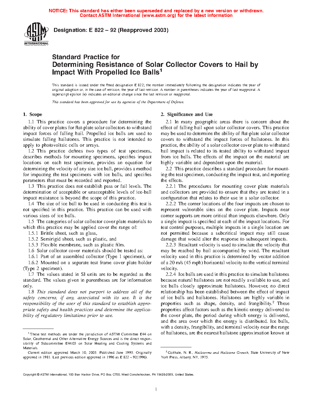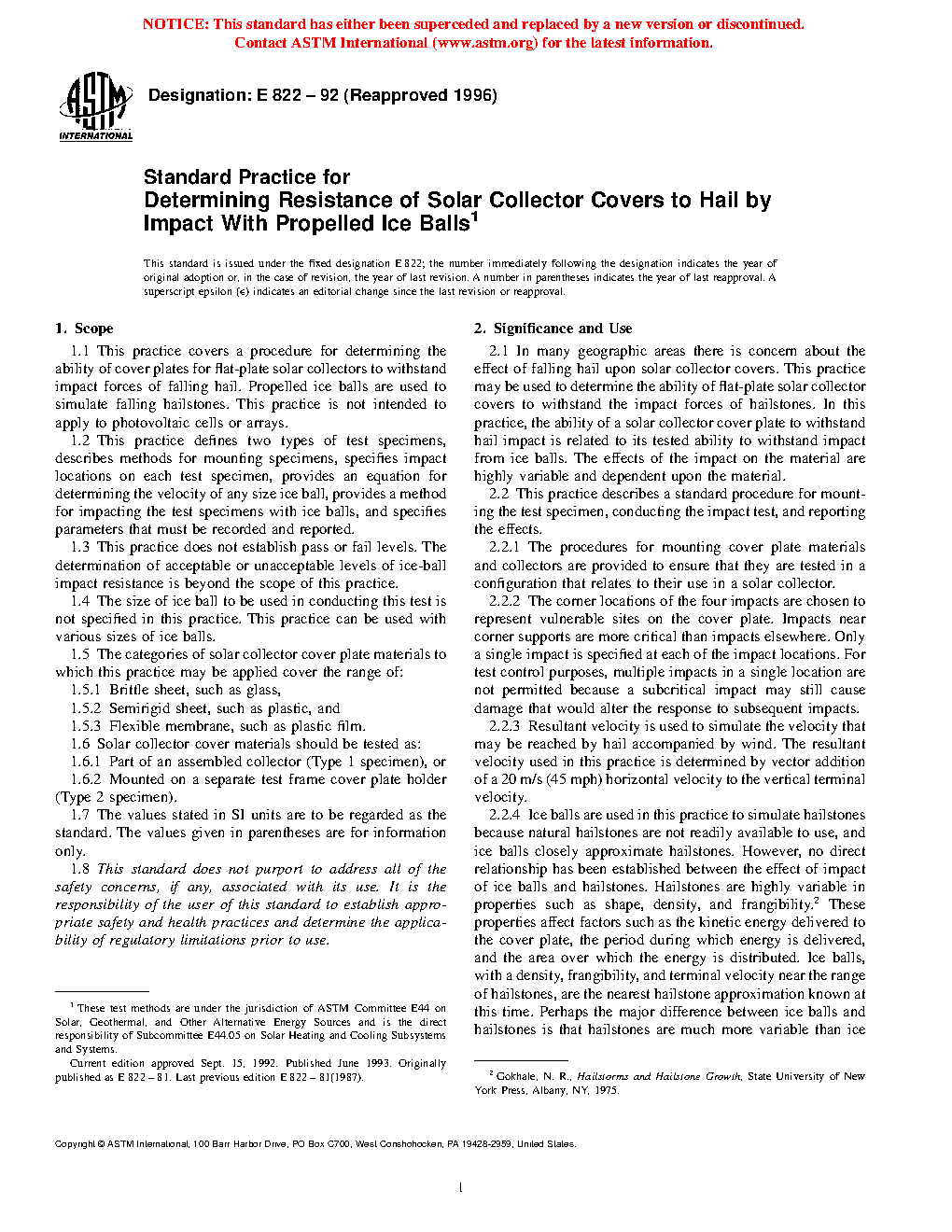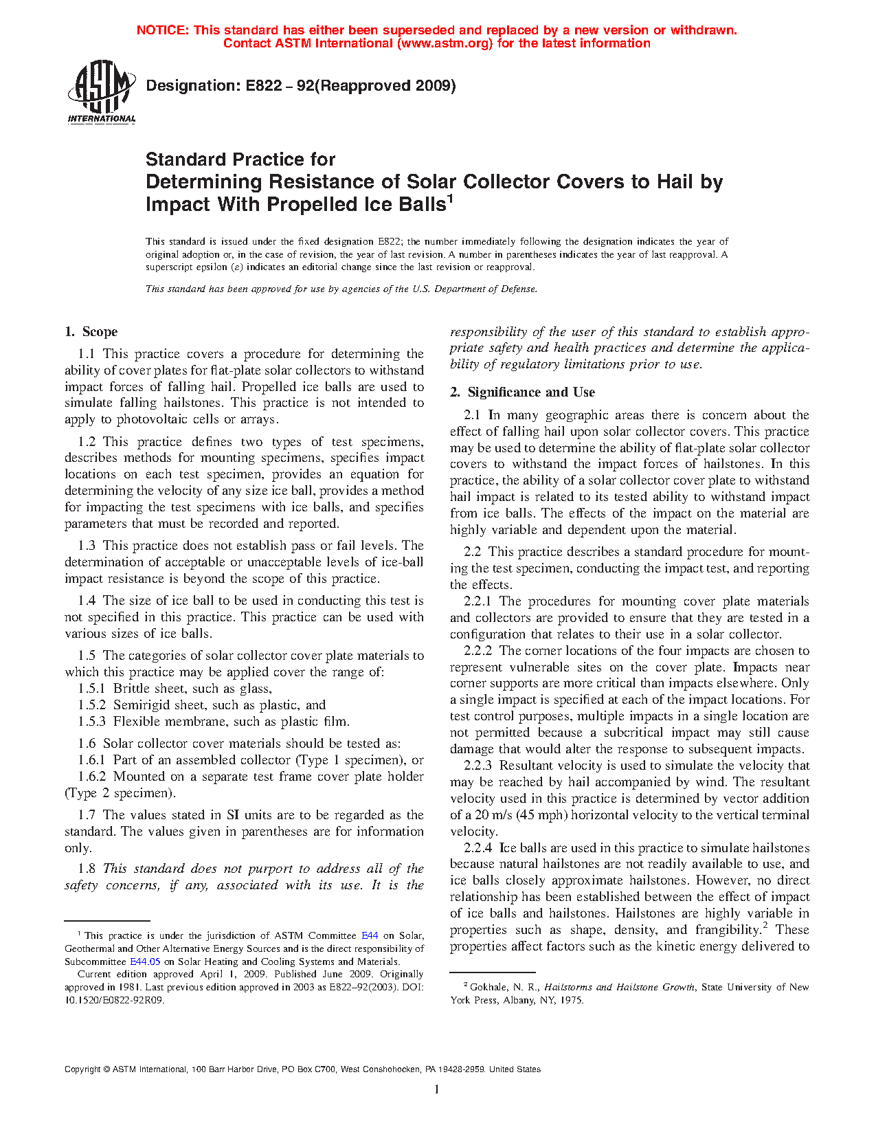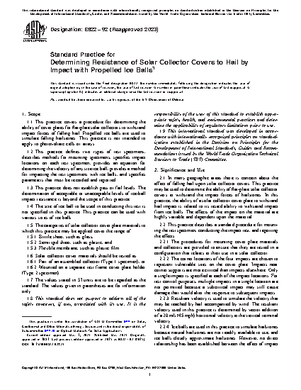 1.1 This practice covers a procedure for determining the ability of cover plates for flat-plate solar collectors to withstand impact forces of falling hail. Propelled ice balls are used to simulate falling hailstones. This practice is not intended to apply to photovoltaic cells or arrays.