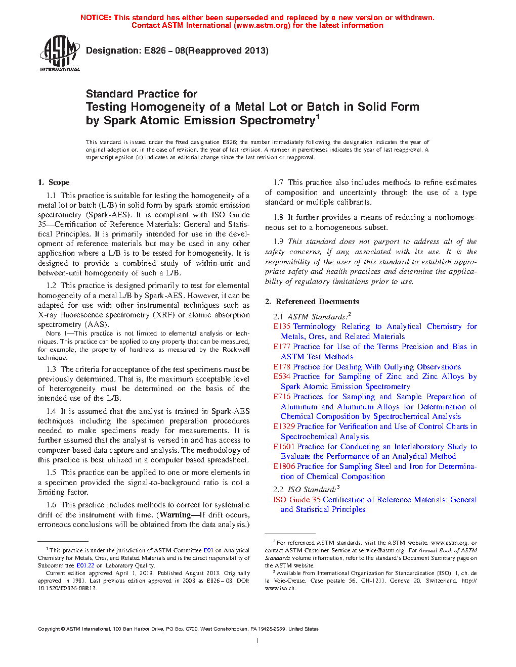 1.1 This practice is suitable for testing the homogeneity of a metal lot or batch (L/B) in solid form by spark atomic emission spectrometry (Spark-AES). It is compliant with ISO Guide 35—Certification of Reference Materials: General and Statistical Principles. It is primarily intended for use in the development of reference materials but may be used in any other application where a L/B is to be tested for homogeneity. It is designed to provide a combined study of within-unit and between-unit homogeneity of such a L/B.