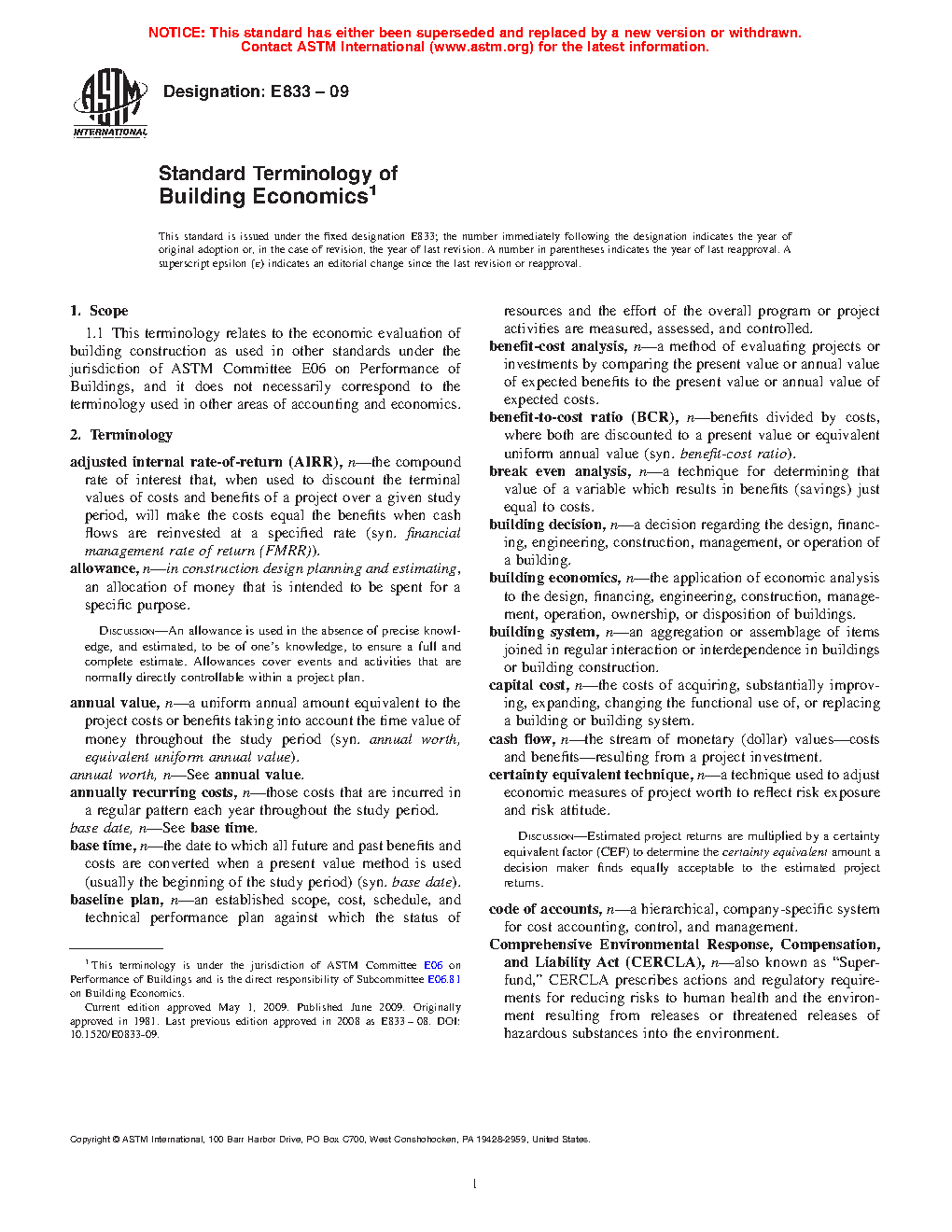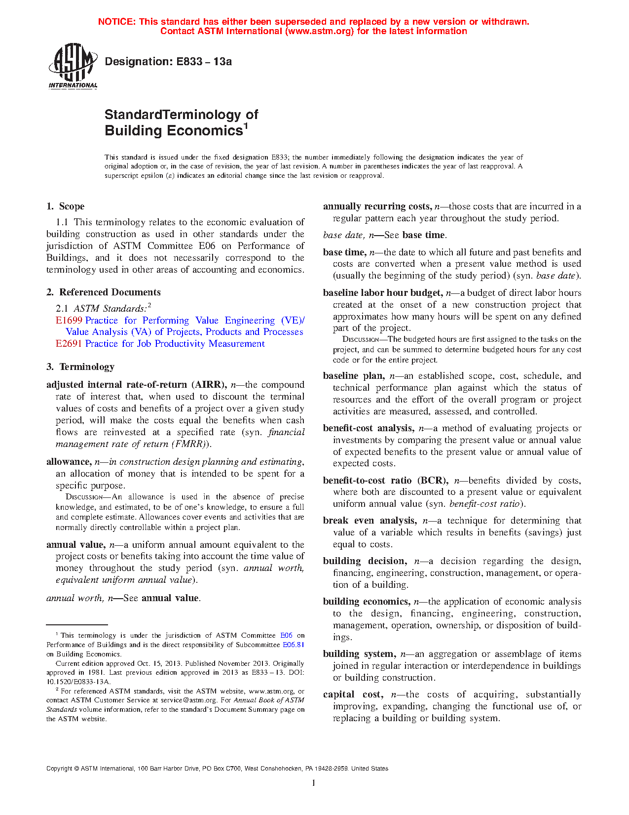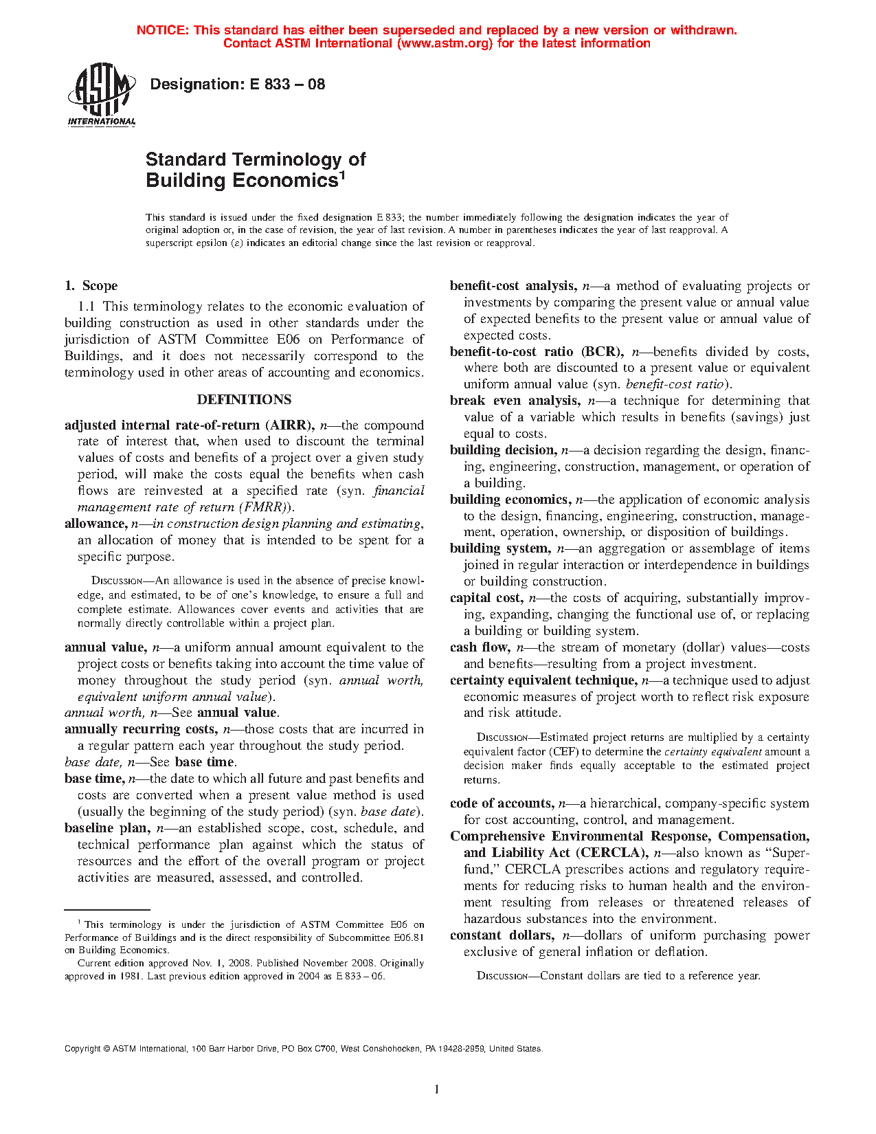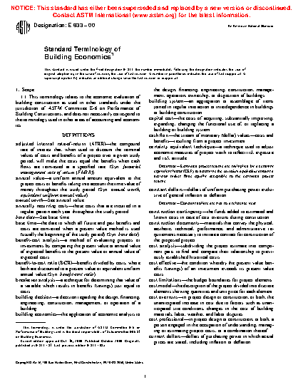 1.1 This terminology relates to the economic evaluation of building construction as used in other standards under the jurisdiction of ASTM Committee E06 on Performance of Building Constructions, and does not necessarily correspond to the terminology used in other areas of accounting and economics.