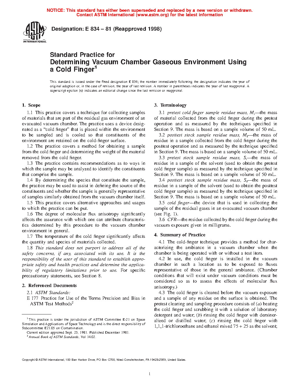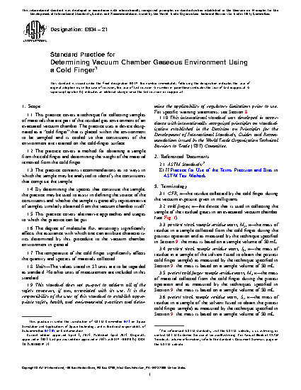 1.1 This practice covers a technique for collecting samples of materials that are part of the residual gas environment of an evacuated vacuum chamber. The practice uses a device designated as a “cold finger” that is placed within the environment to be sampled and is cooled so that constituents of the environment are retained on the cold-finger surface.