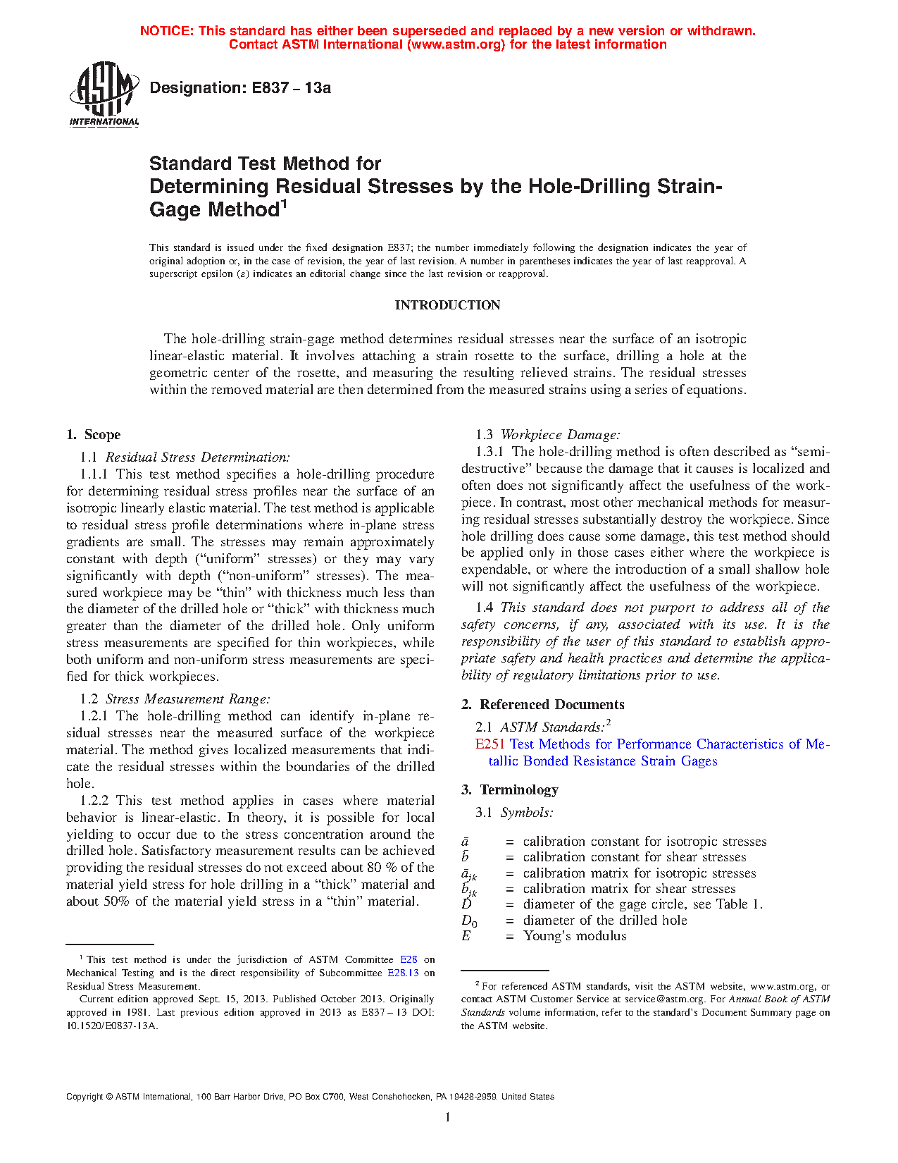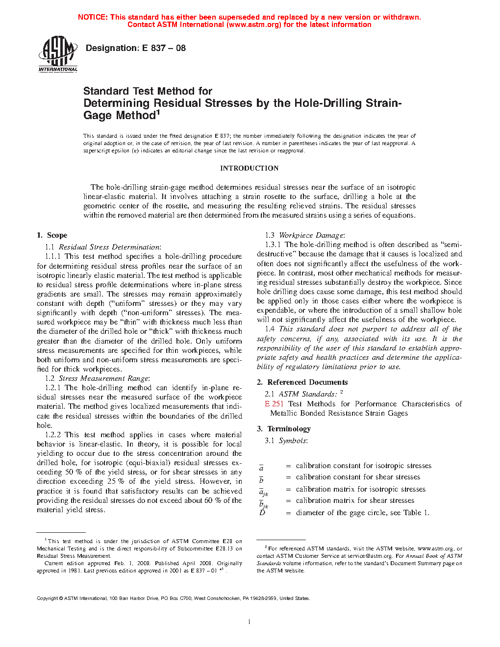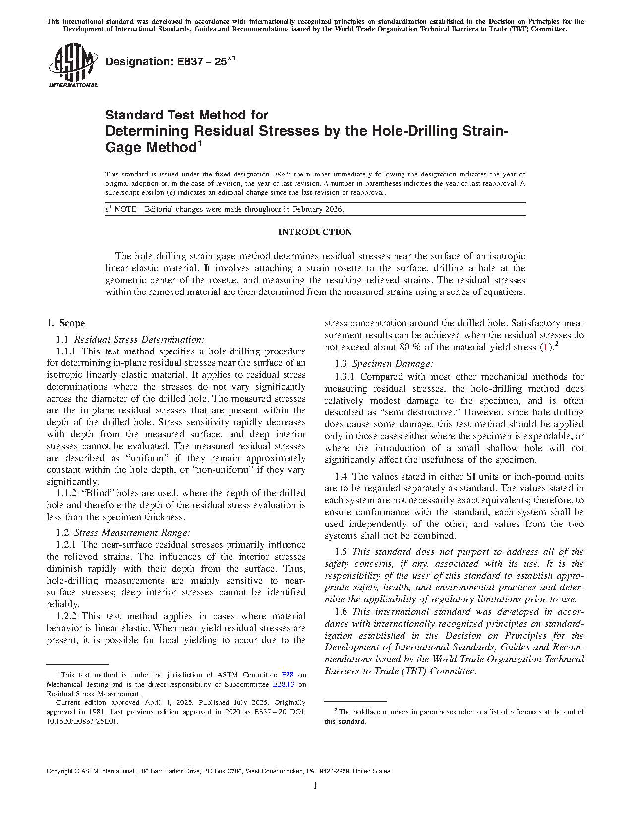 1.1 This test method covers the procedure for determining residual stresses near the surface of isotropic linearly-elastic materials. Although the concept is quite general, the test method described here is applicable in those cases where the stresses do not vary significantly with depth and do not exceed one half of the yield strength. The test method is often described as "semi-destructive" because the damage that it causes is very localized and in many cases does not significantly affect the usefulness of the specimen. In contrast, most other mechanical methods for measuring residual stress substantially destroy the specimen. Since the test method described here does cause some damage, it should be applied only in those cases either where the specimen is expendable or where the introduction of a small shallow hole will not significantly affect the usefulness of the specimen.