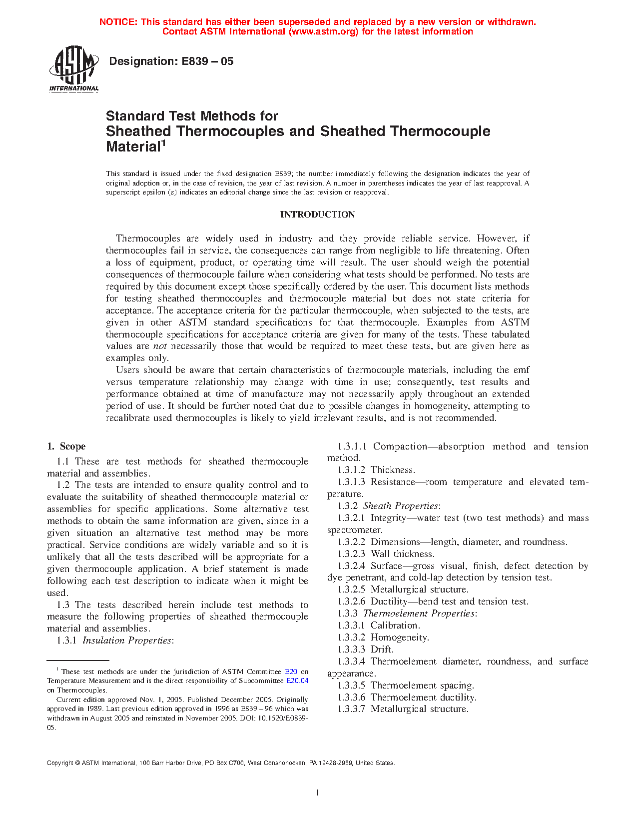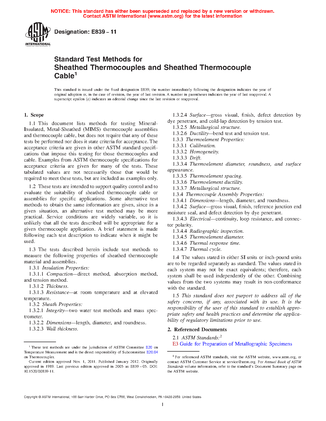 1.2 These tests are intended to support quality control and to evaluate the suitability of sheathed thermocouple cable or assemblies for specific applications. Some alternative test methods to obtain the same information are given, since in a given situation, an alternative test method may be more practical. Service conditions are widely variable, so it is unlikely that all the tests described will be appropriate for a given thermocouple application. A brief statement is made following each test description to indicate when it might be used.