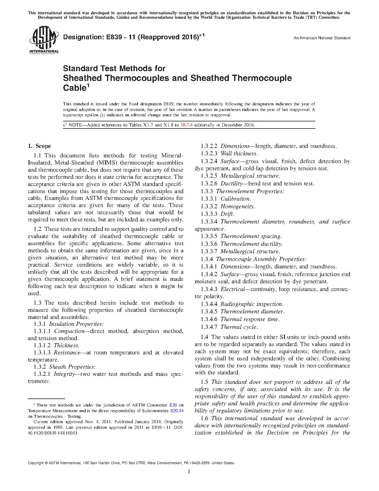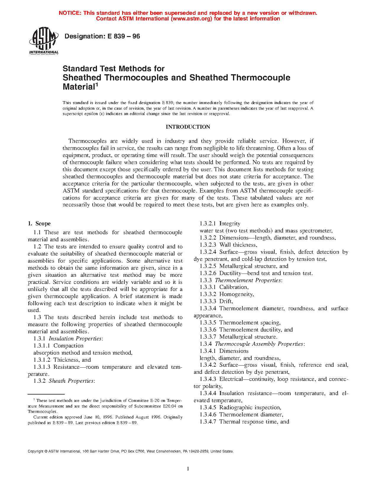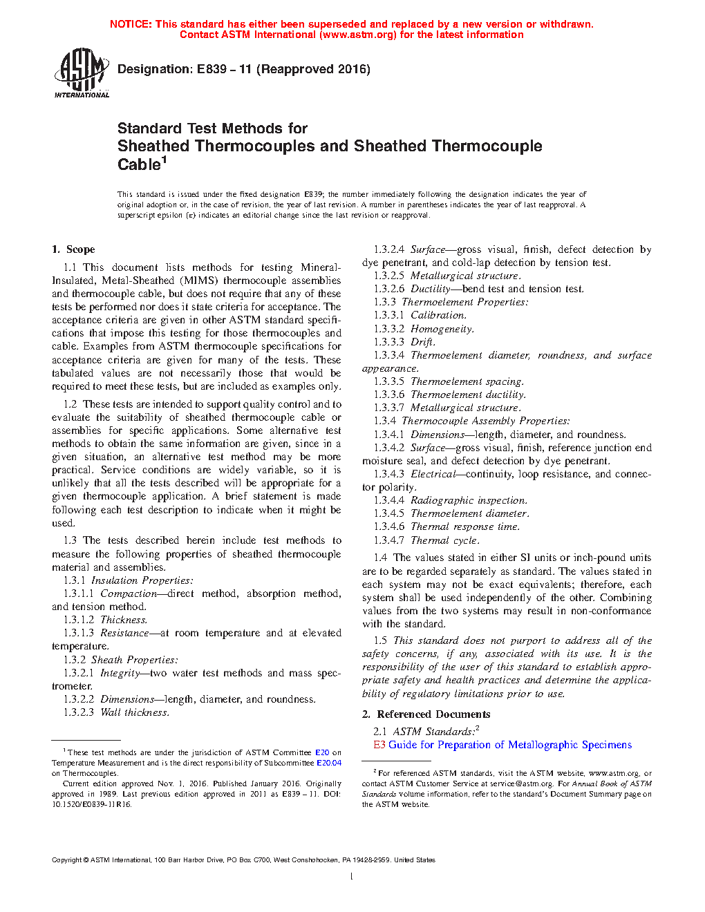 1.1 This document lists methods for testing Mineral-Insulated, Metal-Sheathed (MIMS) thermocouple assemblies and thermocouple cable, but does not require that any of these tests be performed nor does it state criteria for acceptance. The acceptance criteria are given in other ASTM standard specifications that impose this testing for those thermocouples and cable. Examples from ASTM thermocouple specifications for acceptance criteria are given for many of the tests. These tabulated values are not necessarily those that would be required to meet these tests, but are included as examples only.