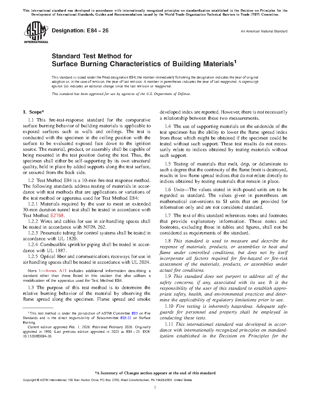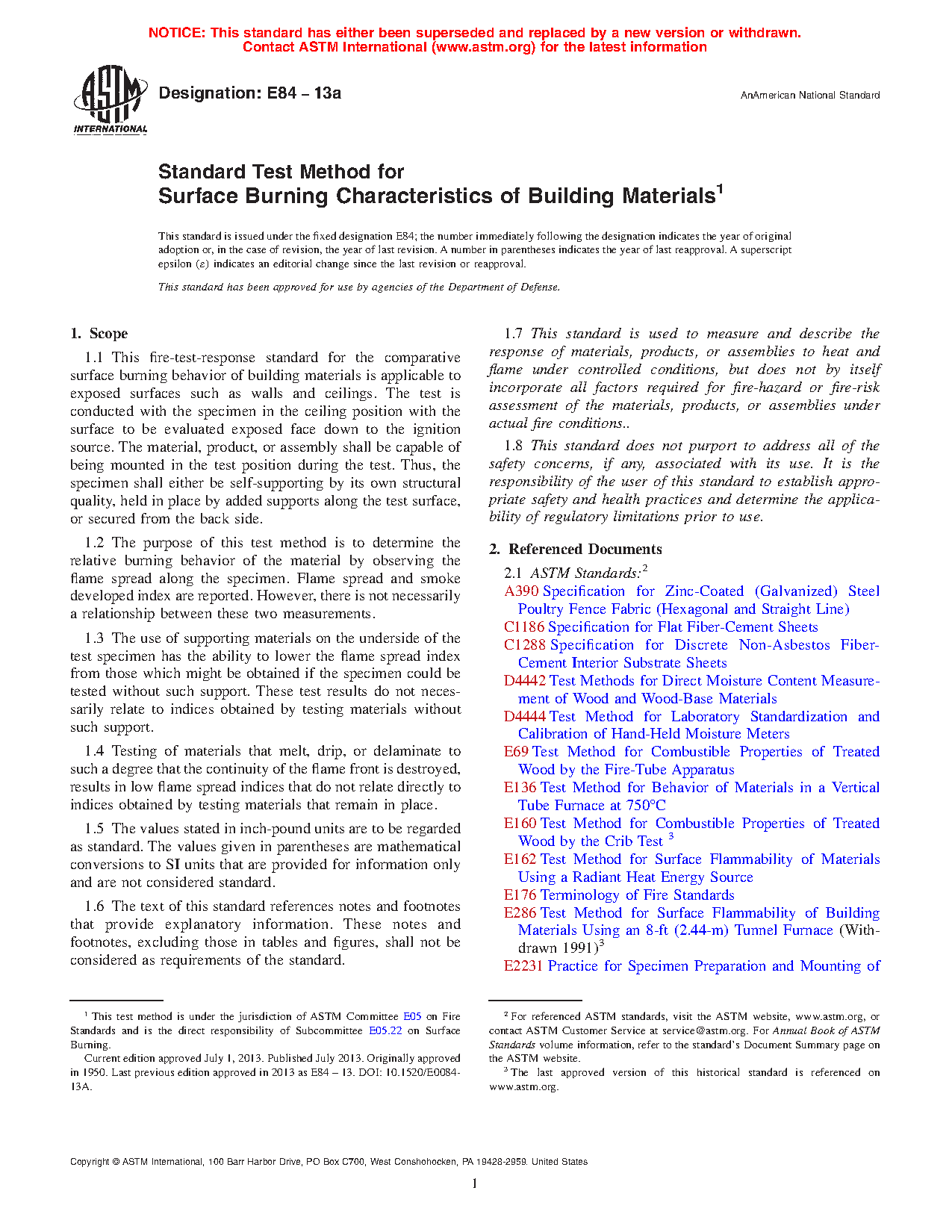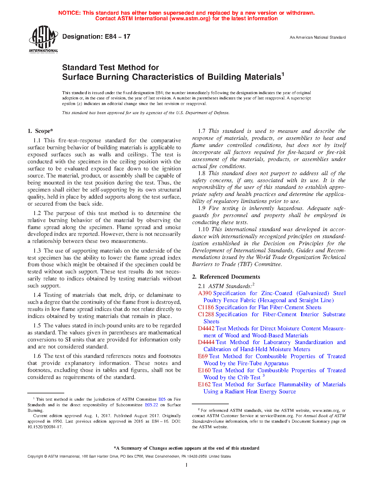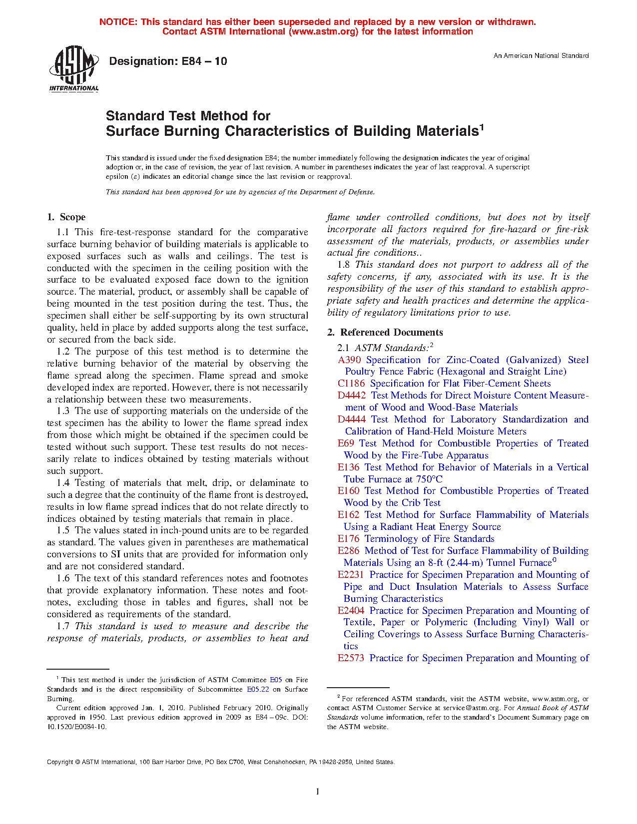 1.2 Test Method E84 is a 10-min fire-test response method. The following standards address testing of materials in accordance with test methods that are applications or variations of the test method or apparatus used for Test Method E84: