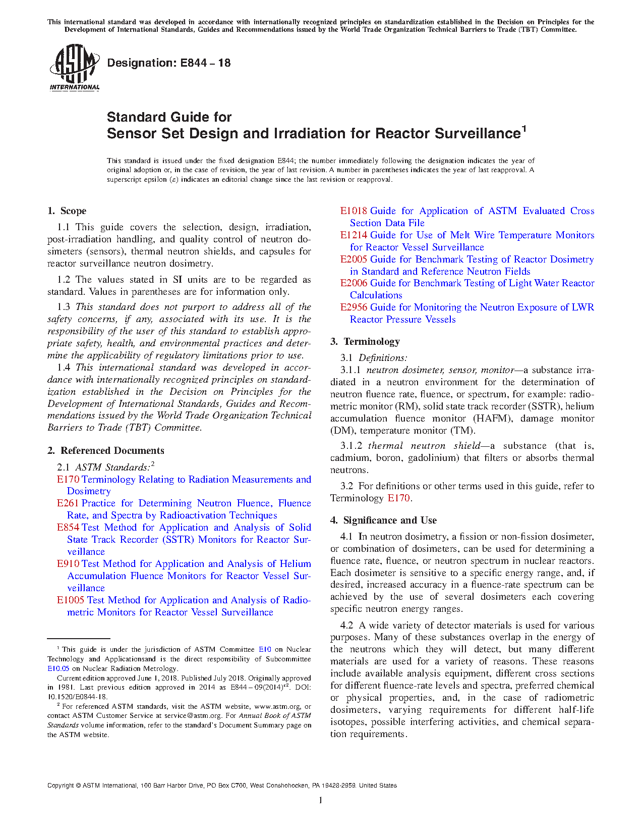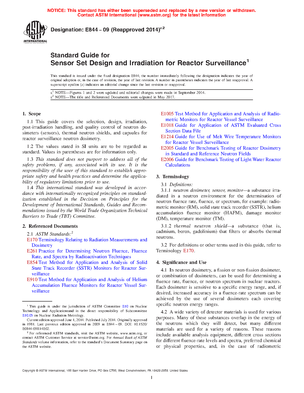 1.1 This guide covers the selection, design, irradiation, post-irradiation handling, and quality control of neutron dosimeters (sensors), thermal neutron shields, and capsules for reactor surveillance neutron dosimetry.