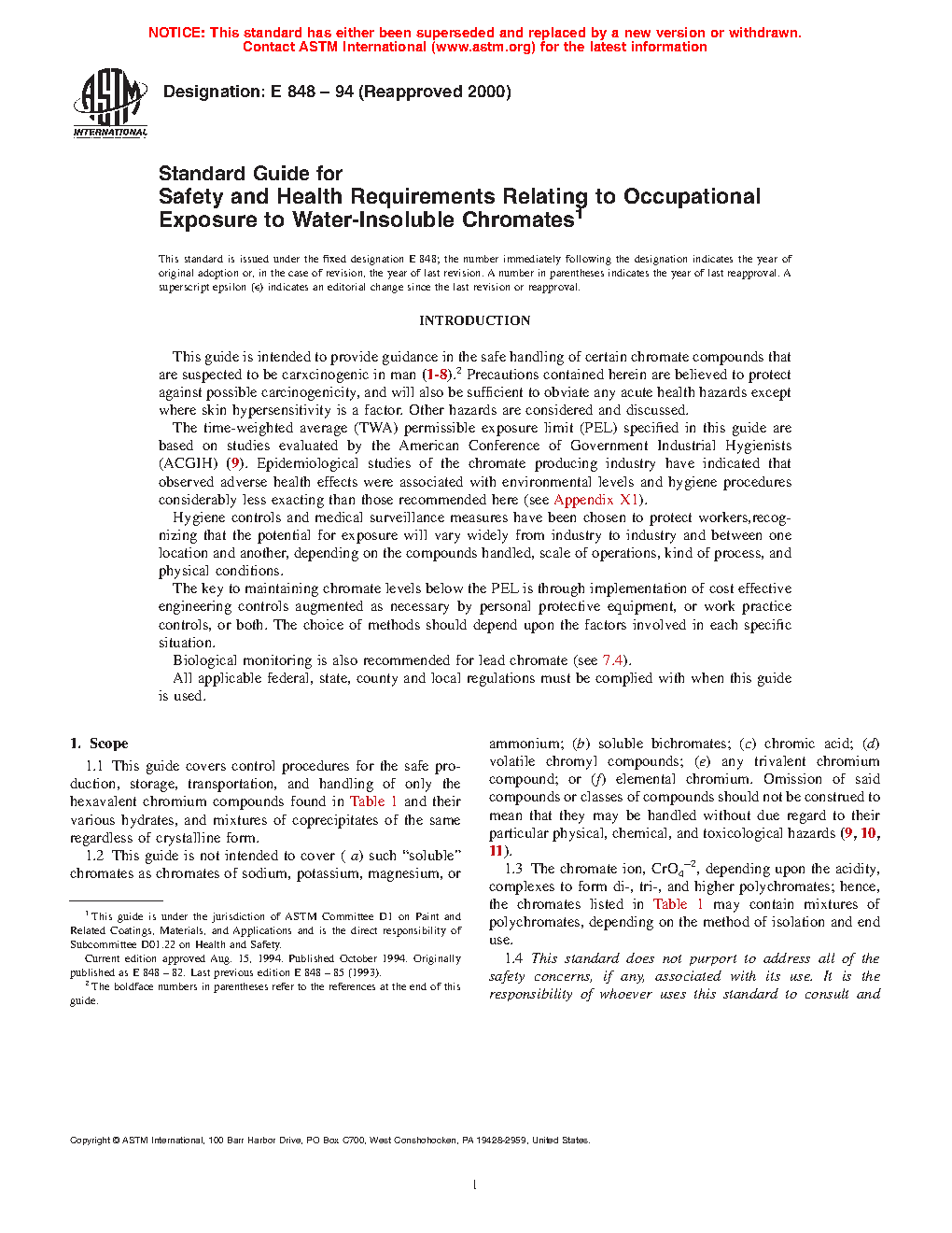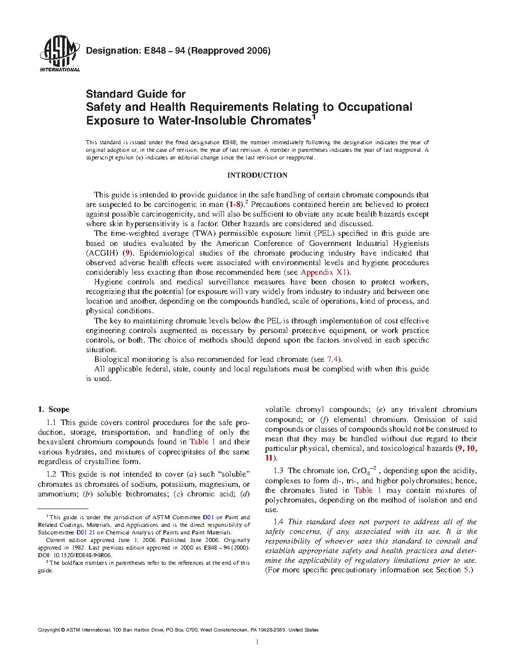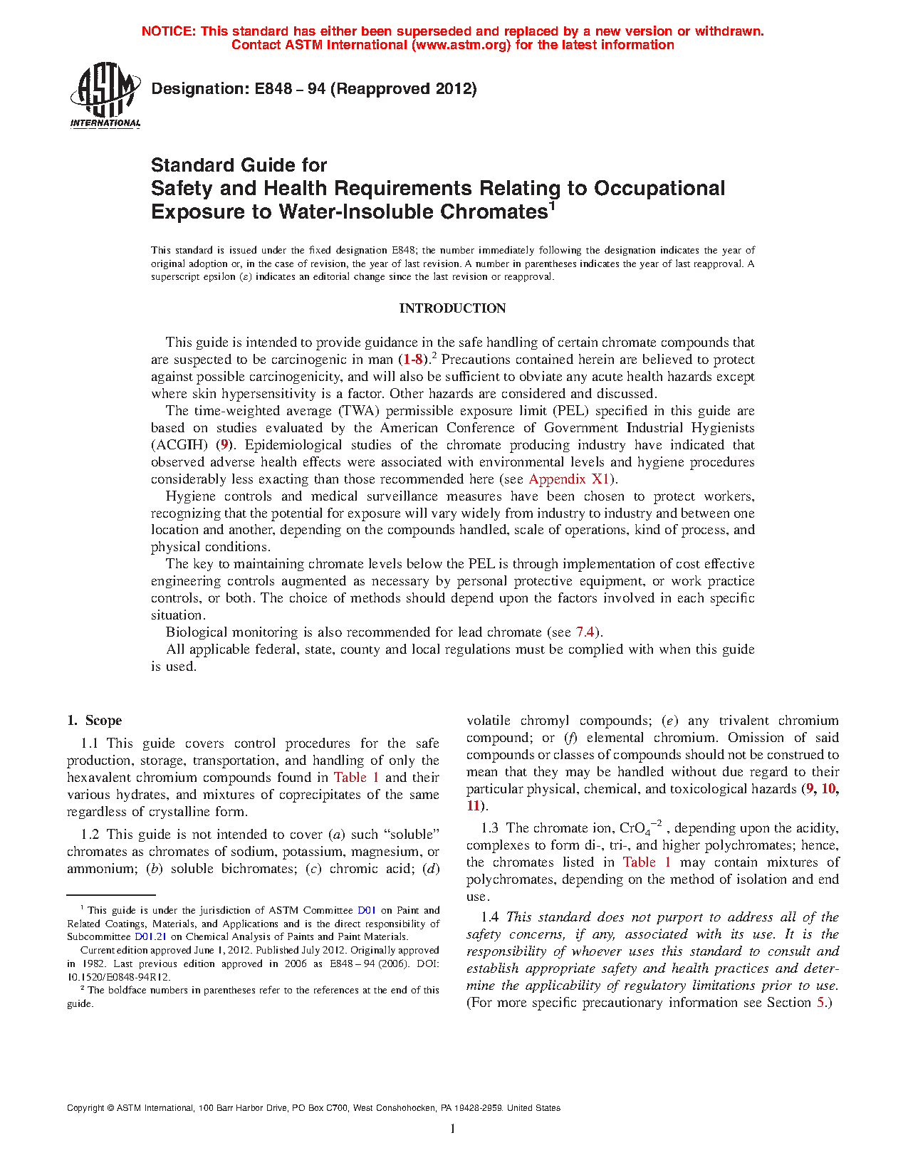 1.2 This guide is not intended to cover ( a) such "soluble" chromates as chromates of sodium, potassium, magnesium, or ammonium; (b) soluble bichromates; (c) chromic acid; (d) volatile chromyl compounds; (e) any trivalent chromium compound; or (f) elemental chromium. Omission of said compounds or classes of compounds should not be construed to mean that they may be handled without due regard to their particular physical, chemical, and toxicological hazards