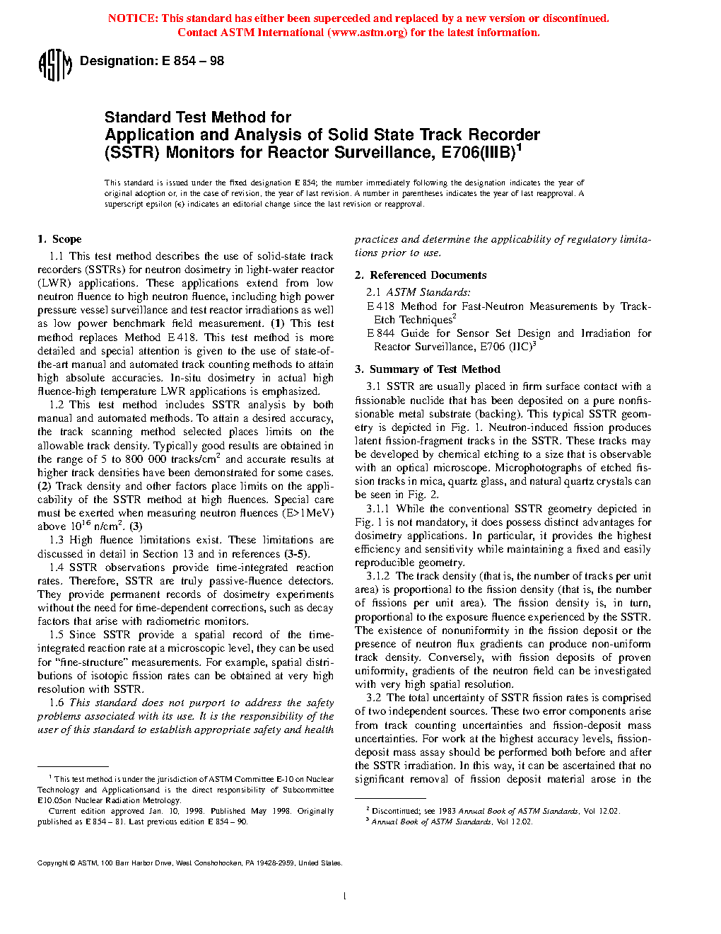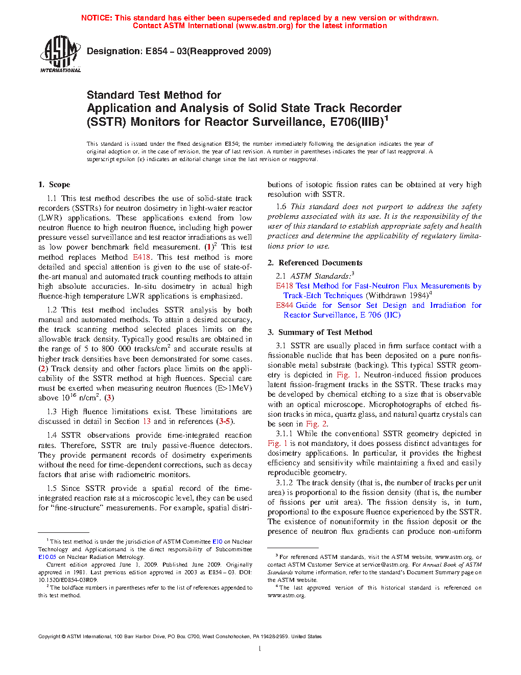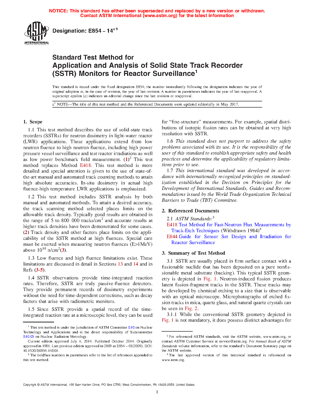 4.4 It is possible to use SSTRs directly for neutron dosimetry as described in 4.1 or to obtain a composite neutron detection efficiency by exposure in a benchmark neutron field. The fluence and spectrum-averaged cross section in this benchmark field must be known. Furthermore, application in other neutron fields may require adjustments due to spectral deviation from the benchmark field spectrum used for calibration. In any event, it must be stressed that the SSTR-fission density measurements can be carried out completely independent of any cross-section standards (6). Therefore, for certain applications, the independent nature of this test method should not be compromised. On the other hand, many practical applications exist wherein this factor is of no consequence so that benchmark field calibration would be entirely appropriate.