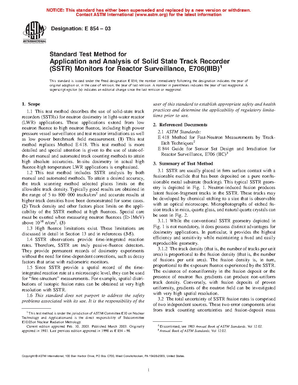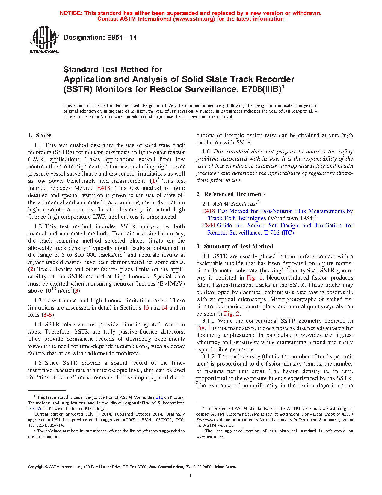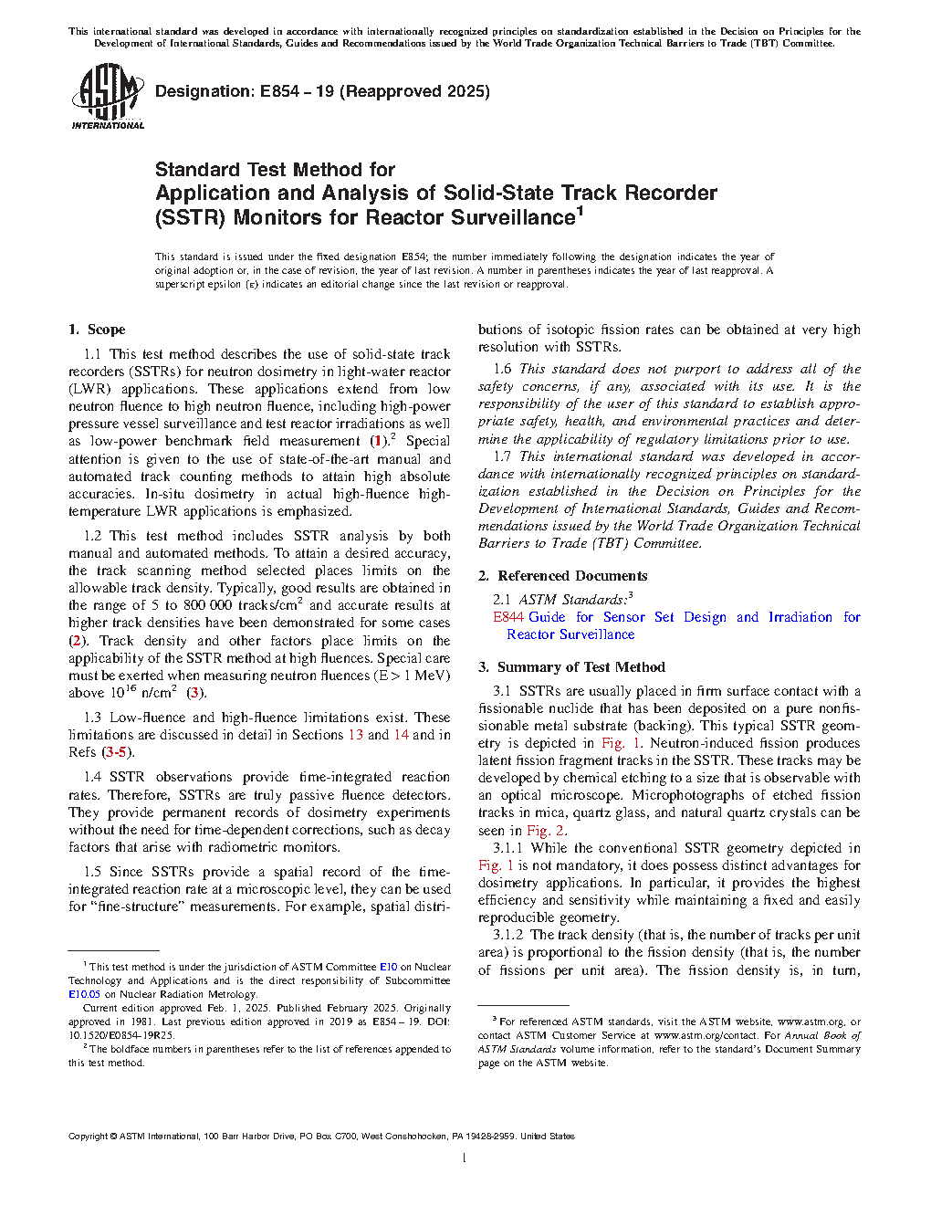 1.1 This test method describes the use of solid-state track recorders (SSTRs) for neutron dosimetry in light-water reactor (LWR) applications. These applications extend from low neutron fluence to high neutron fluence, including high power pressure vessel surveillance and test reactor irradiations as well as low power benchmark field measurement. (1)2 Special attention is given to the use of state-of-the-art manual and automated track counting methods to attain high absolute accuracies. In-situ dosimetry in actual high fluence-high temperature LWR applications is emphasized.