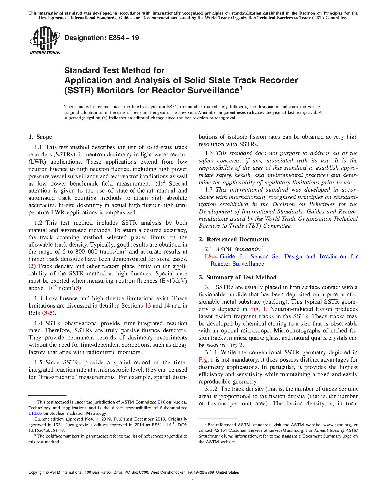 1.2 This test method includes SSTR analysis by both manual and automated methods. To attain a desired accuracy, the track scanning method selected places limits on the allowable track density. Typically good results are obtained in the range of 5 to 500 000 tracks/cm and accurate results at higher track densities have been demonstrated for some cases. Track density and other factors place limits on the applicability of the SSTR method at high fluences. Special care must be exerted when measuring neutron fluences (E>1MeV) above 10 16 n/cm .