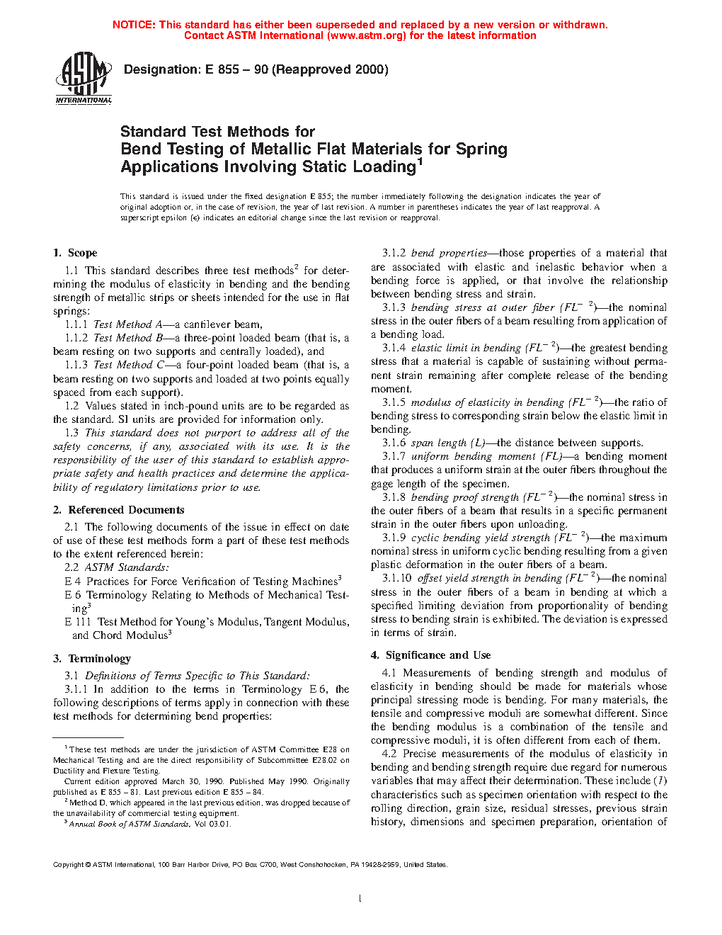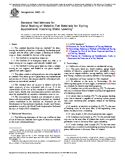 1.1 This standard describes three test methods2 for determining the modulus of elasticity in bending, the bending proof strength, and the offset yield strength in bending of metallic strips or sheets intended for the use in flat springs: