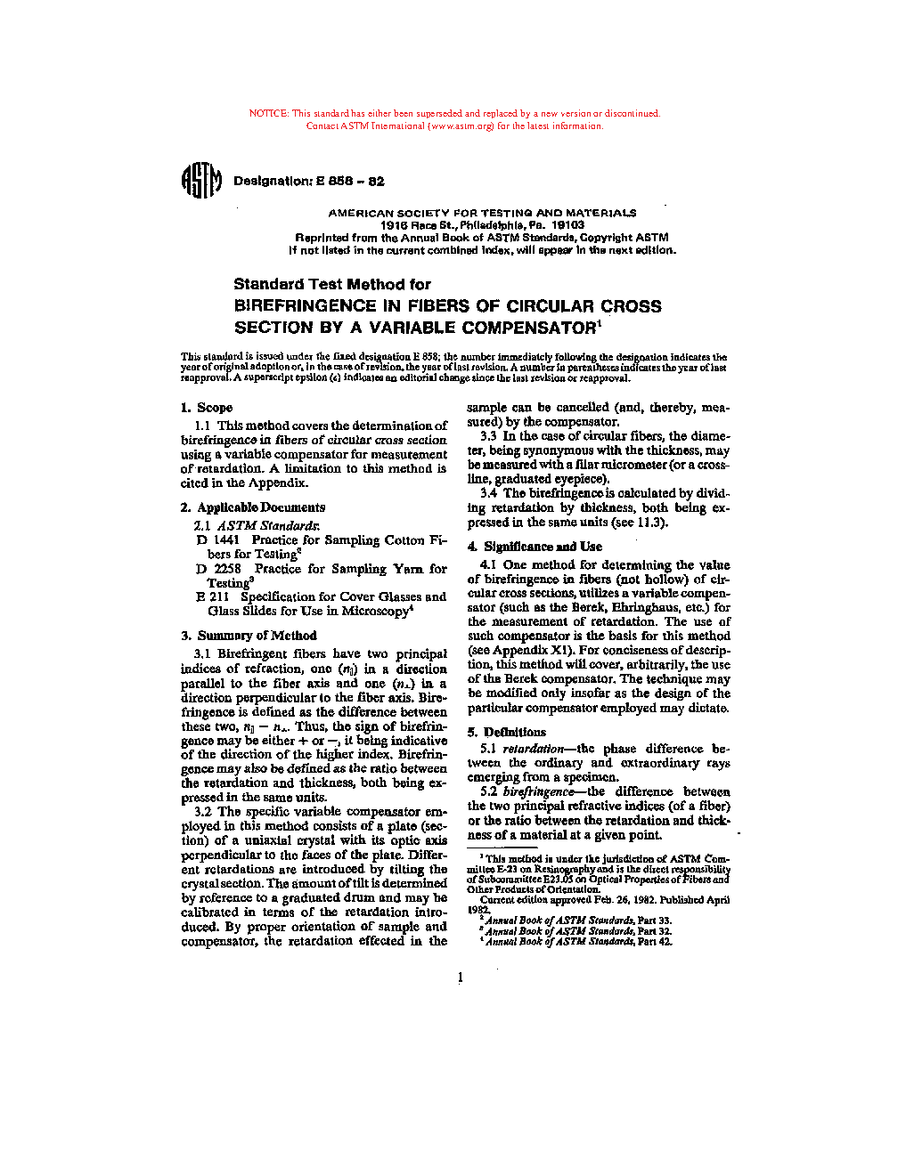Test Method for Birefringence in Fibers of Circular Cross Section by a Variable Compensator (Withdrawn 1989)