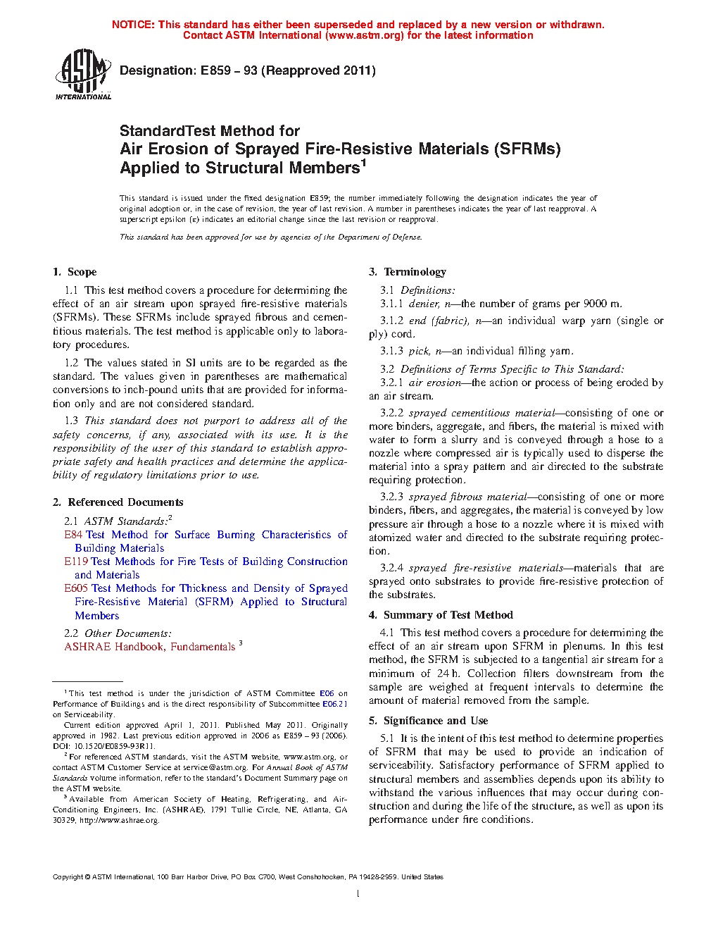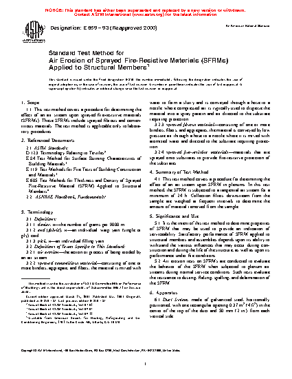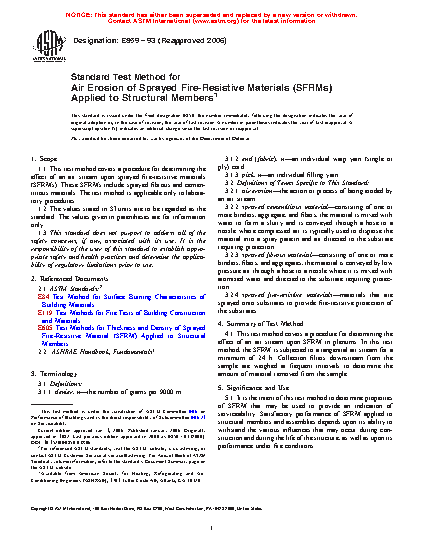 Air erosion tests on SFRMs are conducted to evaluate the behavior of the SFRM when subjected to plenum air streams during normal service conditions. Such tests evaluate the resistance to dusting, flaking, spalling, and delamination of the SFRM.
