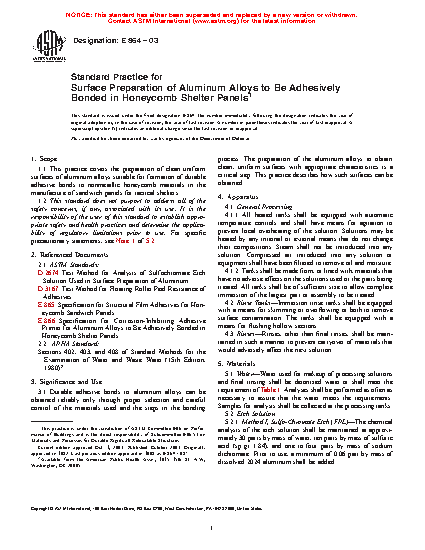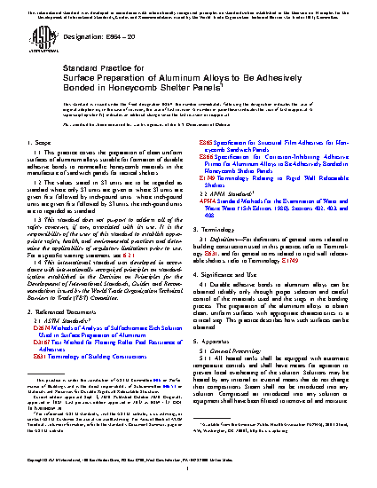 1.1 This practice covers the preparation of clean uniform surfaces of aluminum alloys suitable for formation of durable adhesive bonds to nonmetallic honeycomb materials in the manufacture of sandwich panels for tactical shelters.