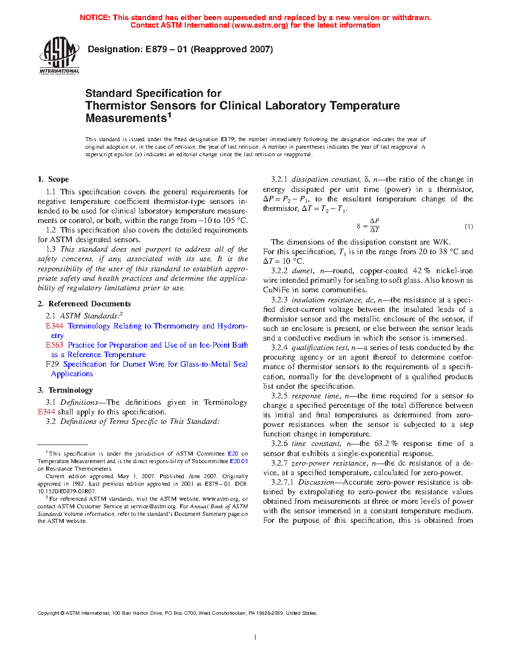 1.1 This specification covers the general requirements for Negative Temperature Coefficient (NTC) thermistor-type sensors intended to be used for laboratory temperature measurements or control, or both, within the range from -10 °C to 105 °C.