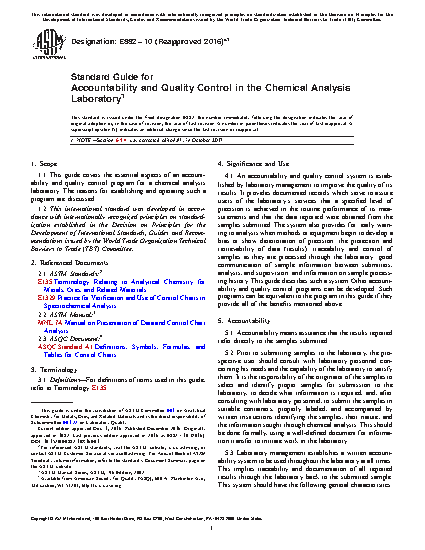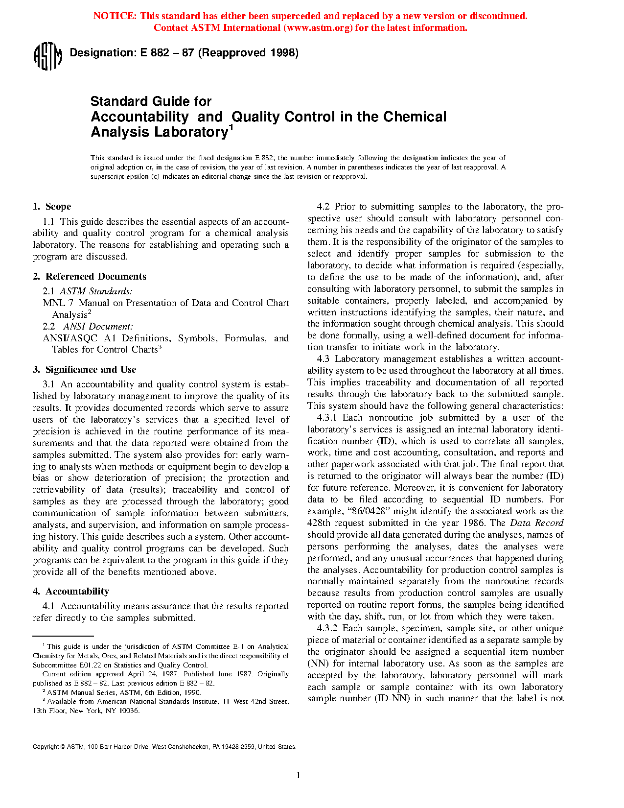 An accountability and quality control system is established by laboratory management to improve the quality of its results. It provides documented records which serve to assure users of the laboratory’services that a specified level of precision is achieved in the routine performance of its measurements and that the data reported were obtained from the samples submitted. The system also provides for: early warning to analysts when methods or equipment begin to develop a bias or show deterioration of precision; the protection and retrievability of data (results); traceability and control of samples as they are processed through the laboratory; good communication of sample information between submitters, analysts, and supervision; and information on sample processing history. This guide describes such a system. Other accountability and quality control programs can be developed. Such programs can be equivalent to the program in this guide if they provide all of the benefits mentioned above.