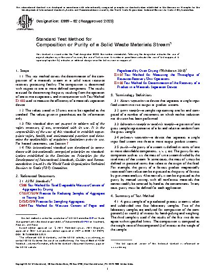 1.1 This test method covers the determination of the composition of a materials stream in a solid waste resource recovery processing facility. The composition is determined with respect to one or more defined components. The results are used for determining the purity resulting from the operation of one or more separators, and in conjunction with Test Method E1108 used to measure the efficiency of a materials separation device.