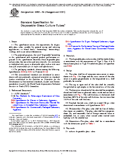 1.1 This specification covers the requirements for disposable glass tubes suitable for general testing and culturing applications in blood banks, hematology, bacteriology, virology, and tissue culture laboratories.