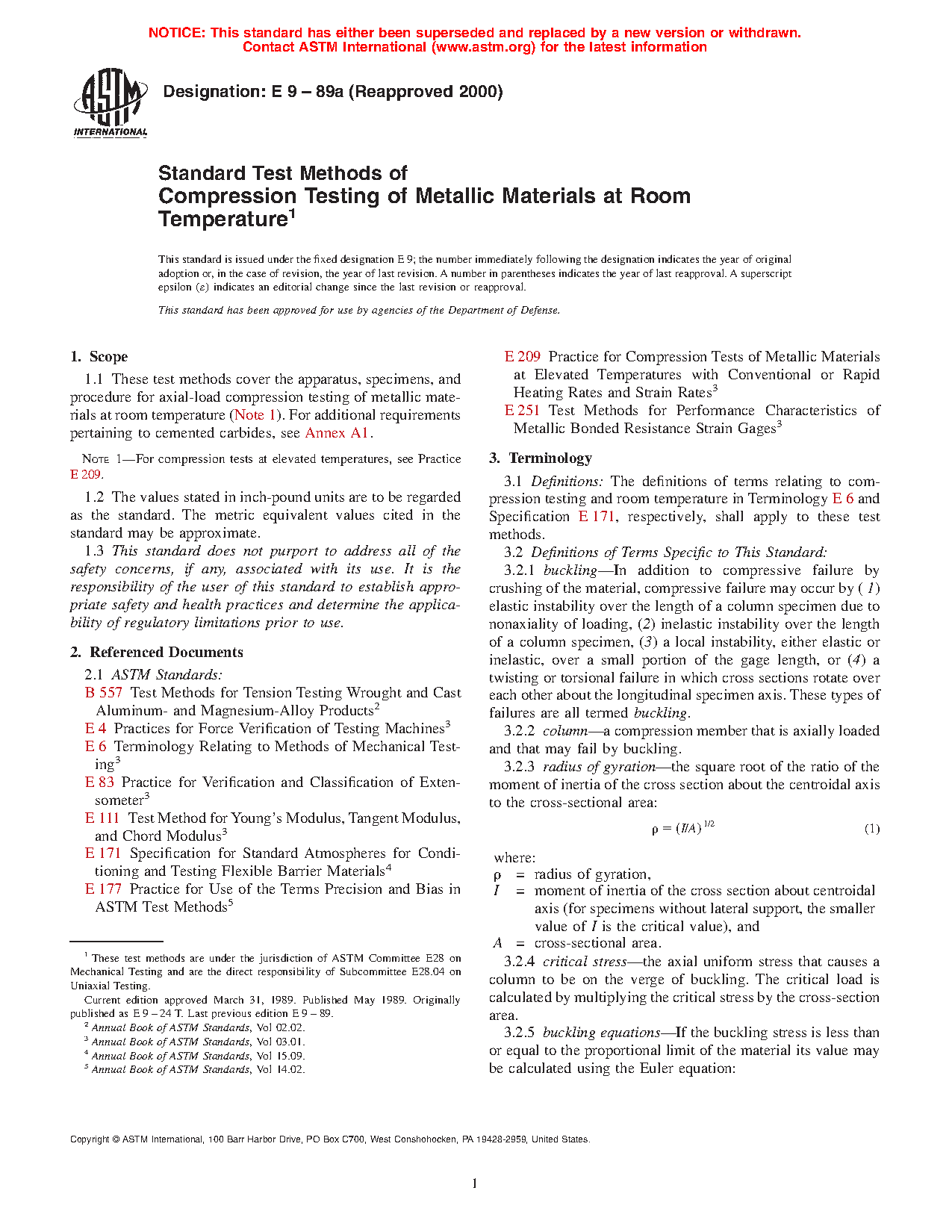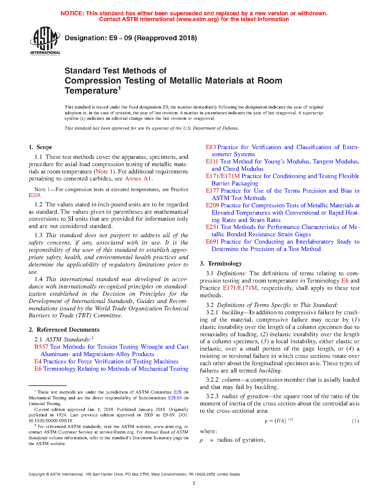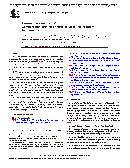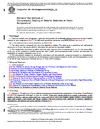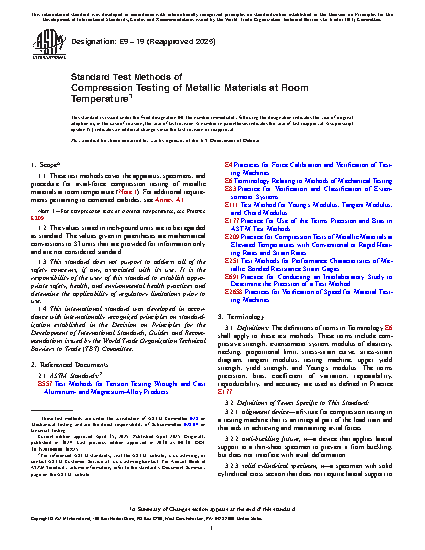 1.1 These test methods cover the apparatus, specimens, and procedure for axial-load compression testing of metallic materials at room temperature (Note 1). For additional requirements pertaining to cemented carbides, see Annex A1.