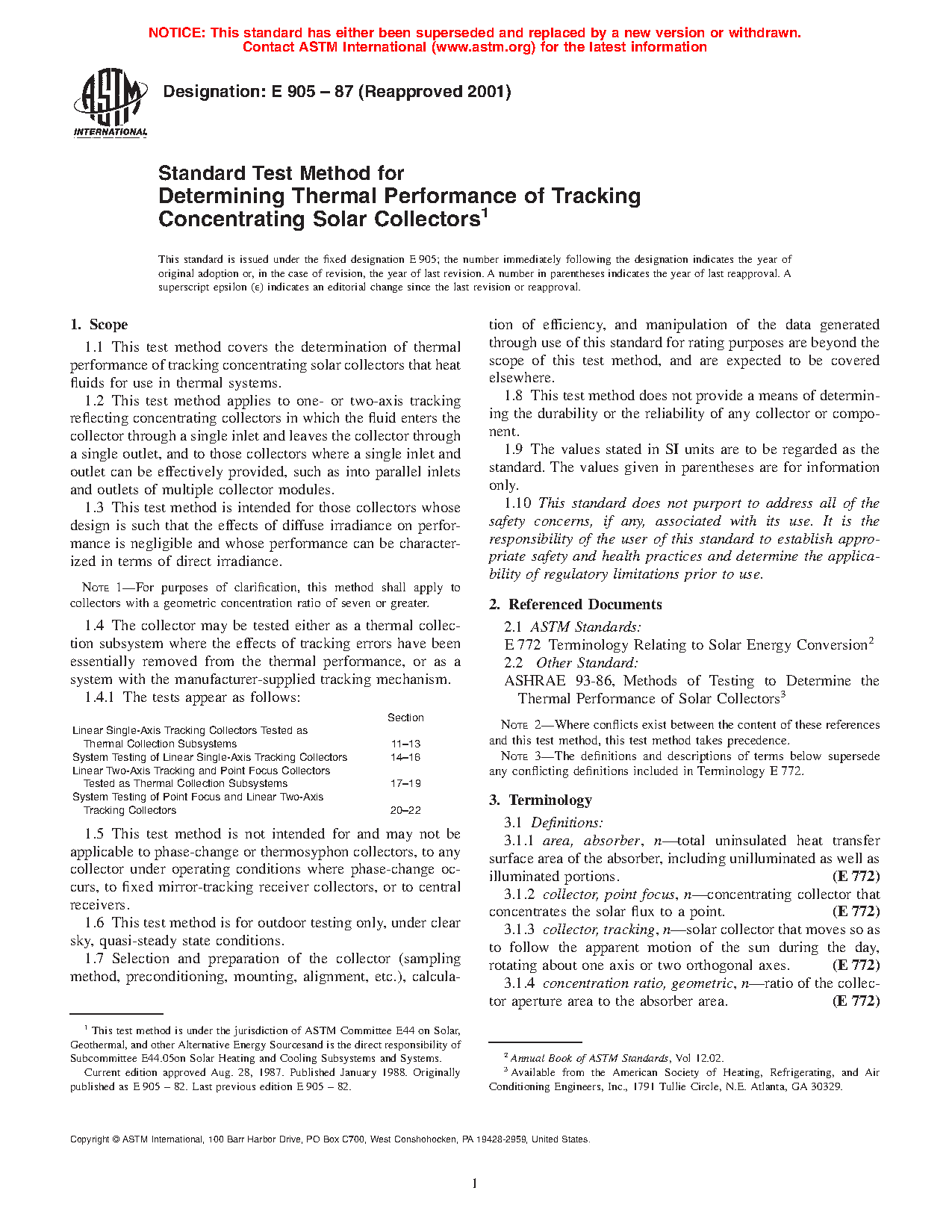1.2 This test method applies to one- or two-axis tracking reflecting concentrating collectors in which the fluid enters the collector through a single inlet and leaves the collector through a single outlet, and to those collectors where a single inlet and outlet can be effectively provided, such as into parallel inlets and outlets of multiple collector modules.