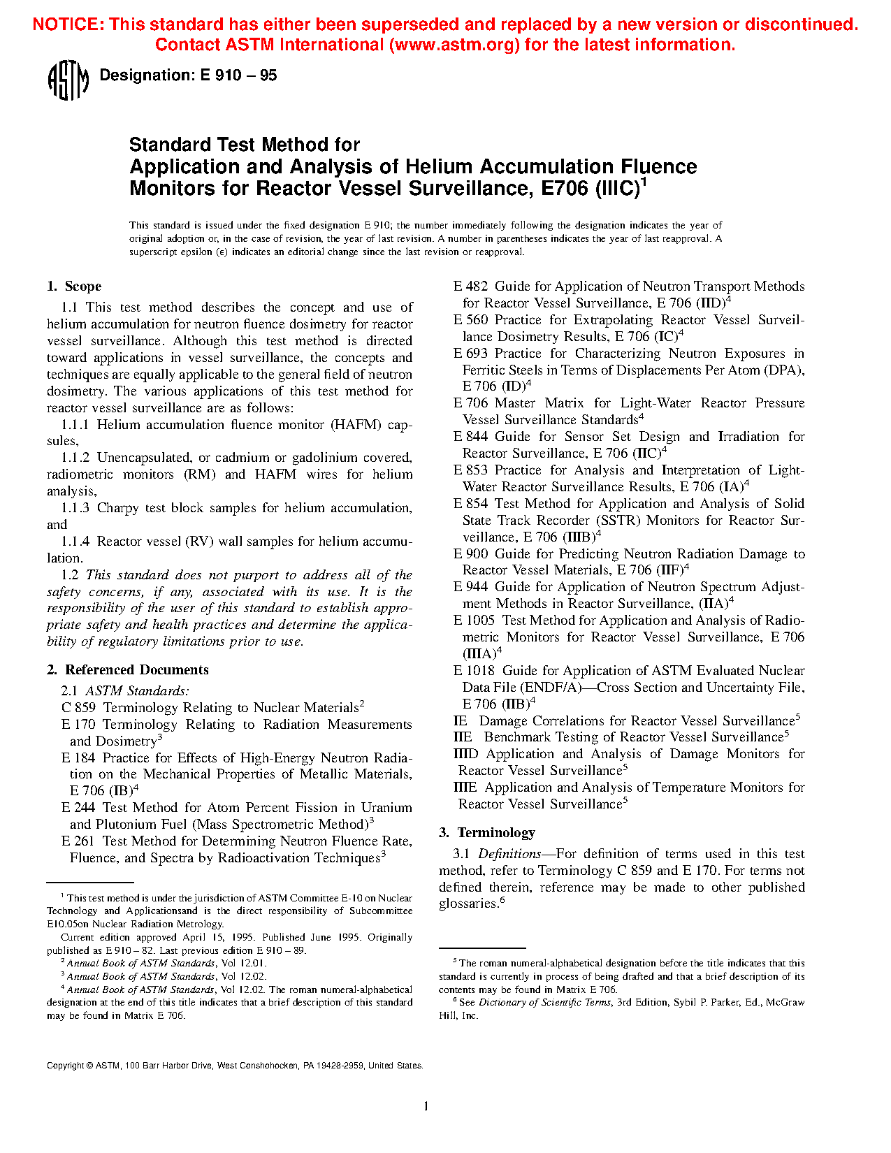 1.1 This test method describes the concept and use of helium accumulation for neutron fluence dosimetry for reactor vessel surveillance. Although this test method is directed toward applications in vessel surveillance, the concepts and techniques are equally applicable to the general field of neutron dosimetry. The various applications of this test method for reactor vessel surveillance are as follows: