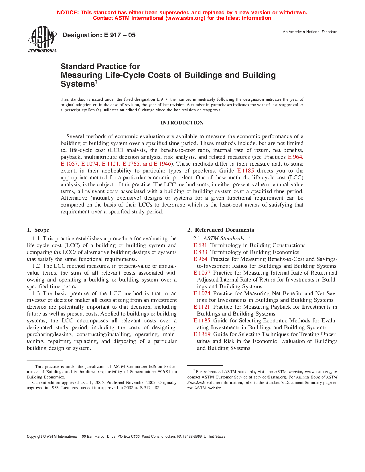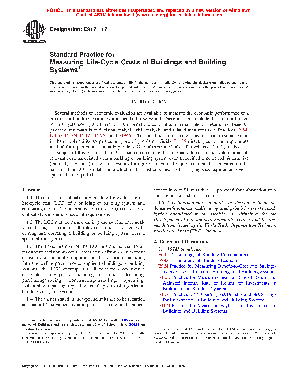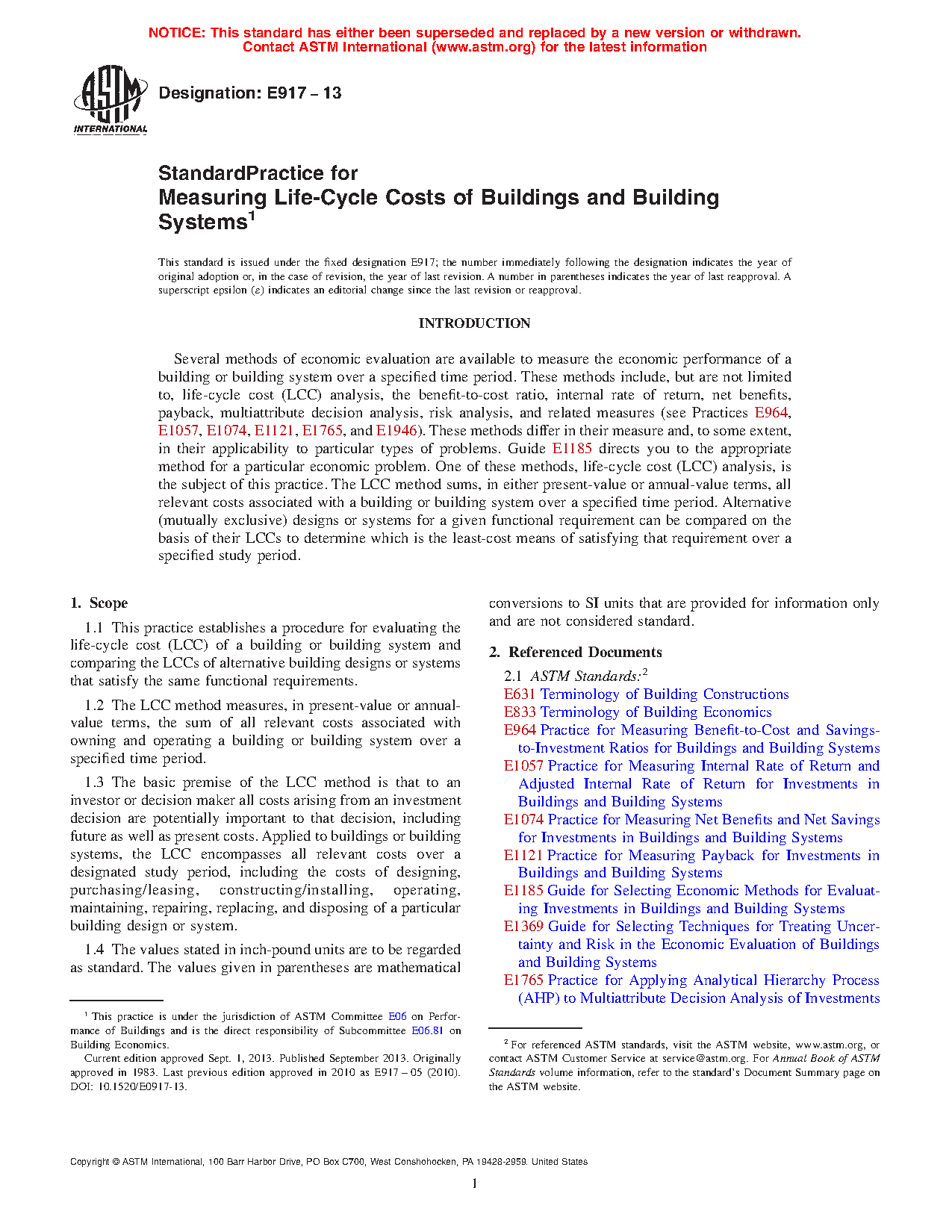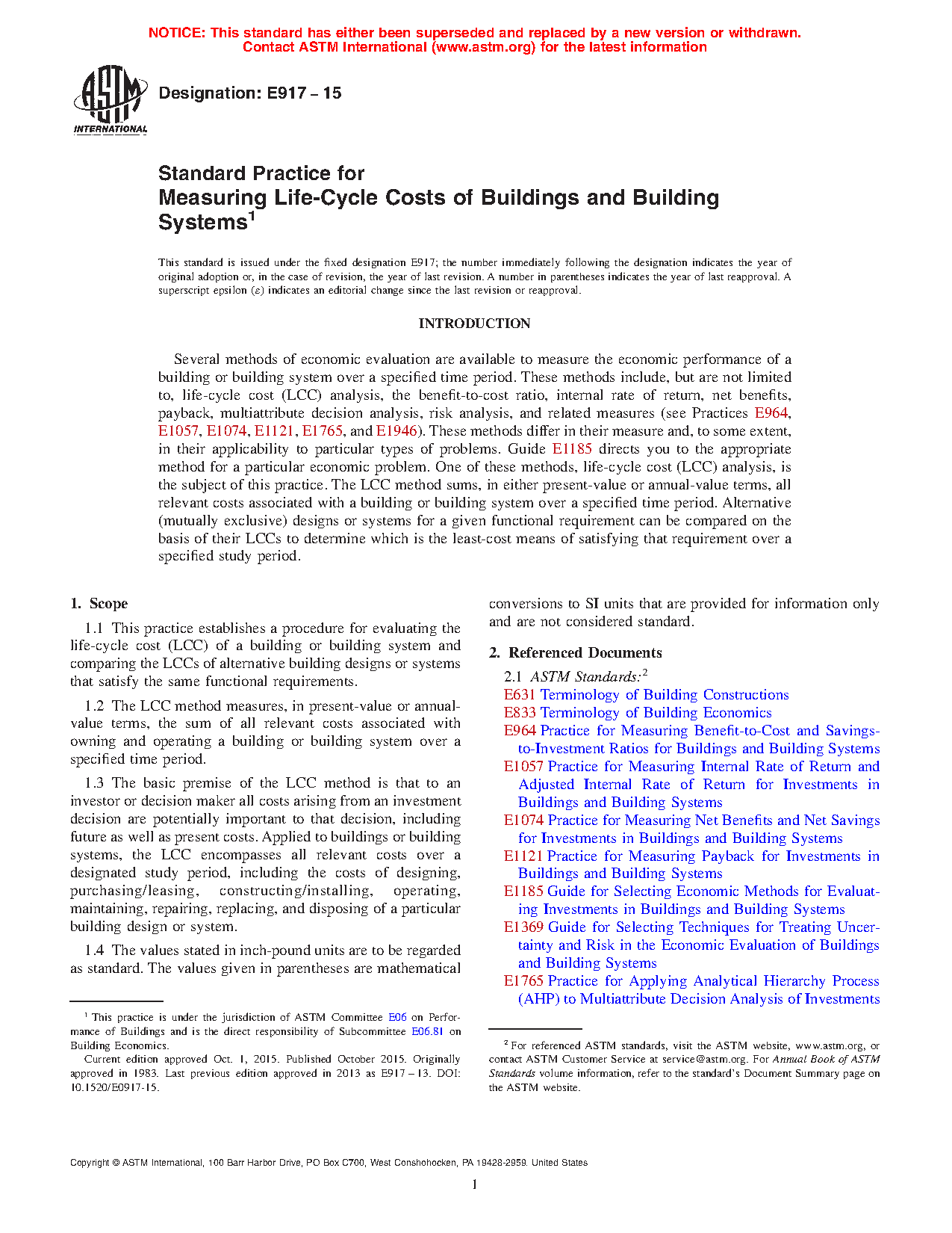 1.1 This practice establishes a procedure for evaluating the life-cycle cost (LCC) of a building or building system and comparing the LCCs of alternative building designs or systems that satisfy the same functional requirements.
