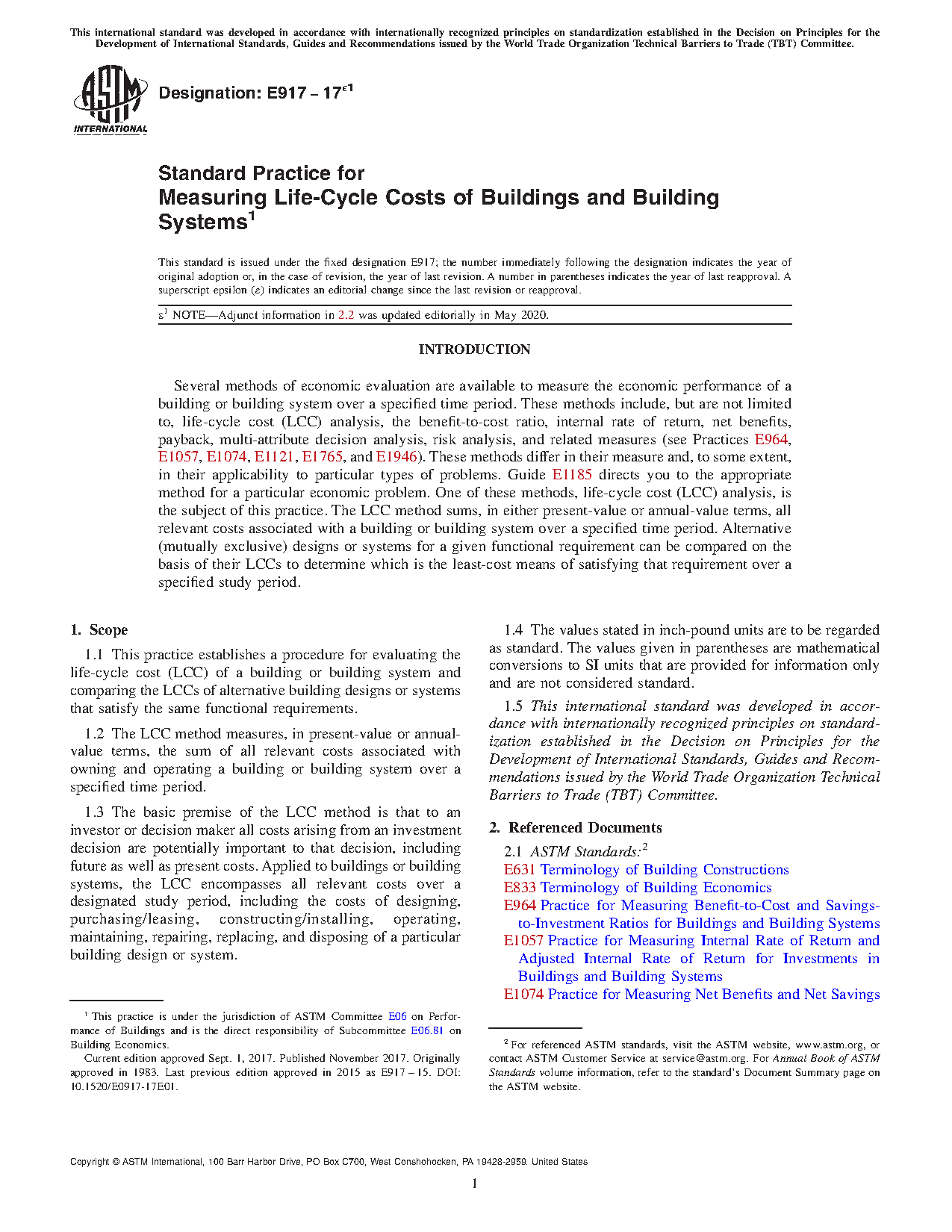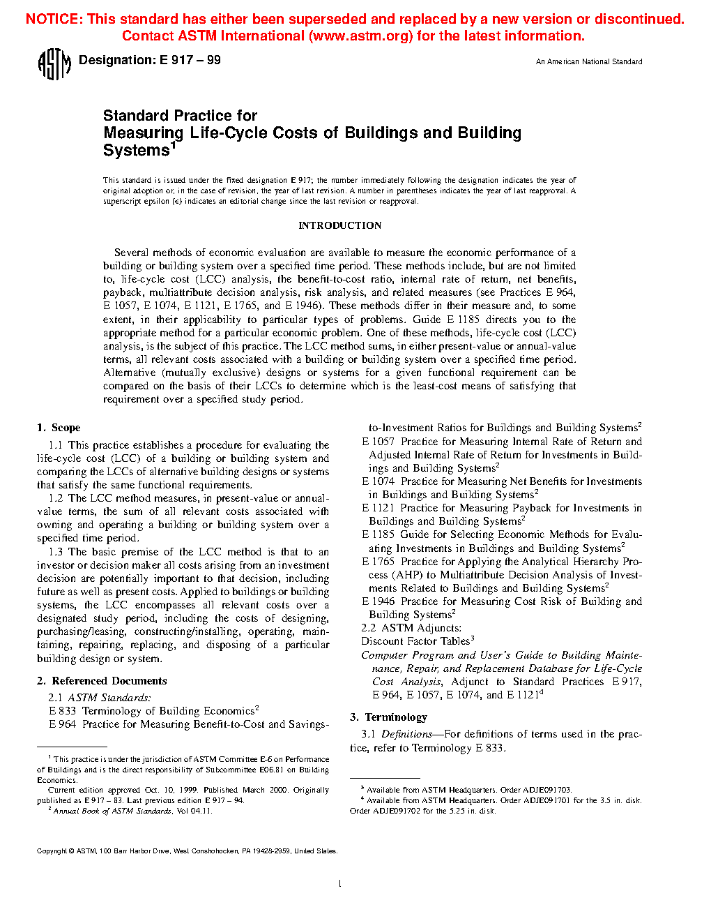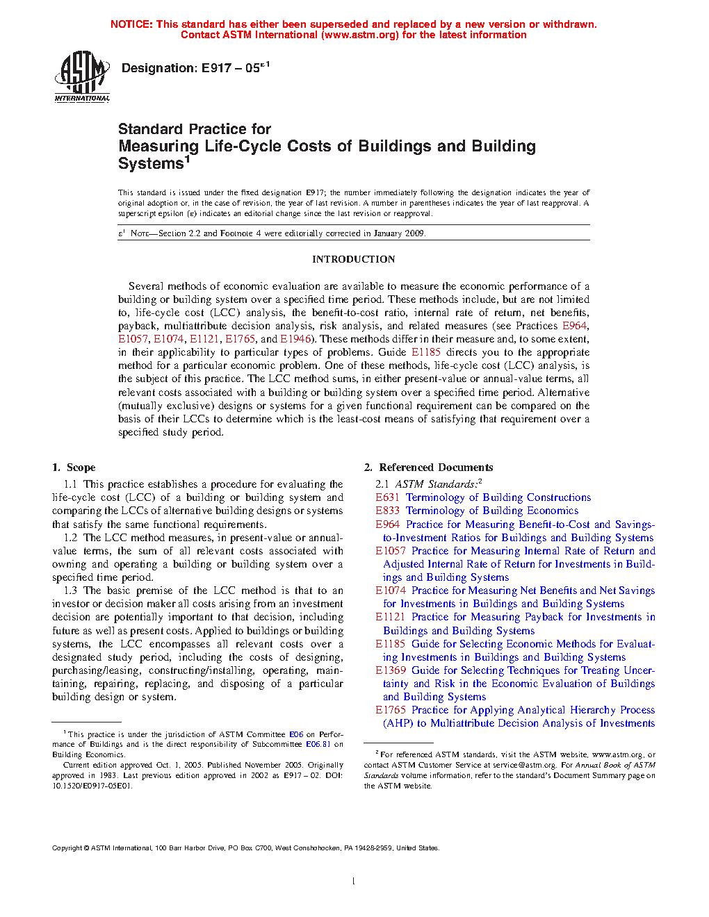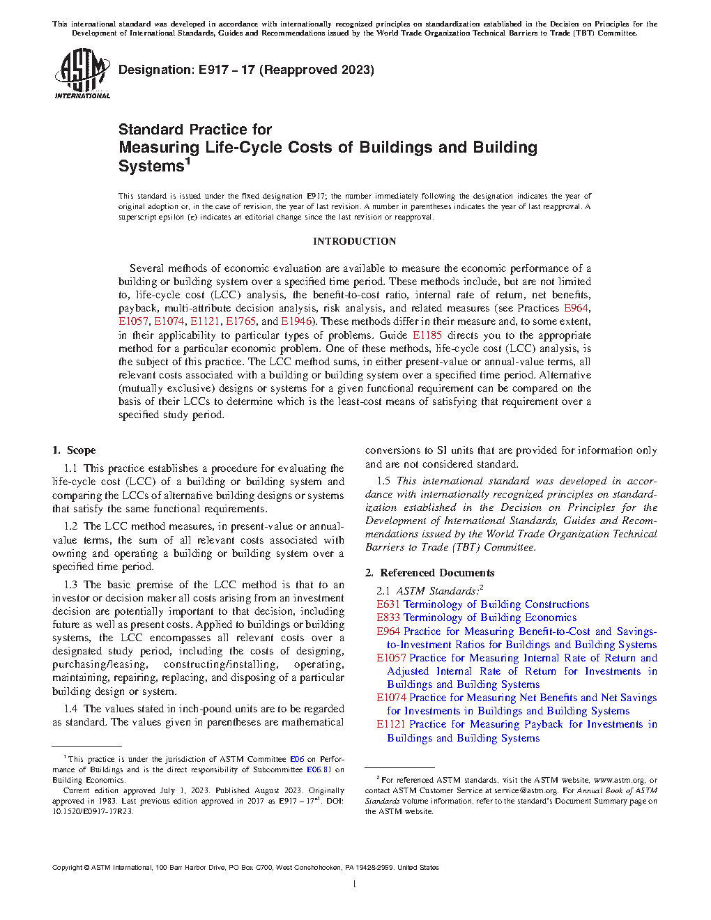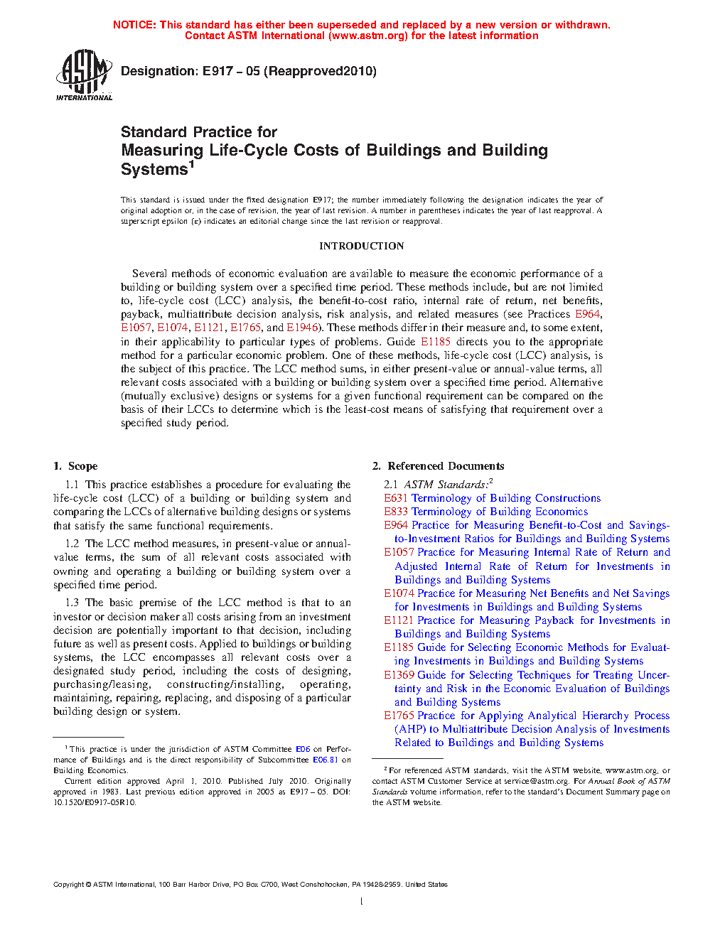1.1 This practice establishes a procedure for evaluating the life-cycle cost (LCC) of a building or building system and comparing the LCCs of alternative building designs or systems that satisfy the same functional requirements.
