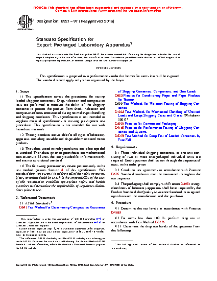 This specification covers the requirements, acceptable criteria, and testing procedures for examining loaded shipping containers. Drop, vibration, and compression tests shall be performed to measure the ability of the shipping container to protect the product from shock, vibration, and compression forces encountered during normal export handling and shipping conditions. This specification is not intended to supplant material specifications or existing preshipment test procedures, and is not intended for use with hazardous materials as well.