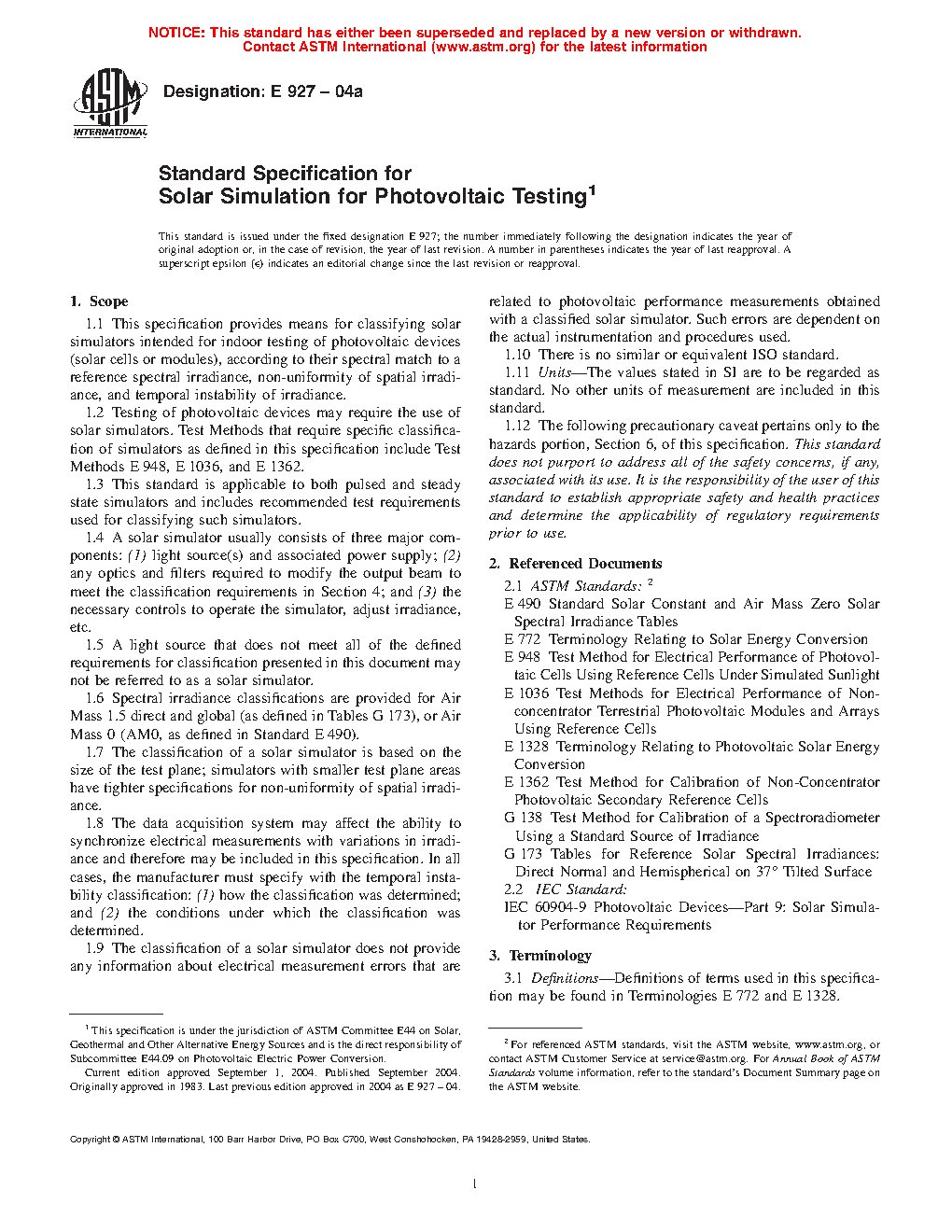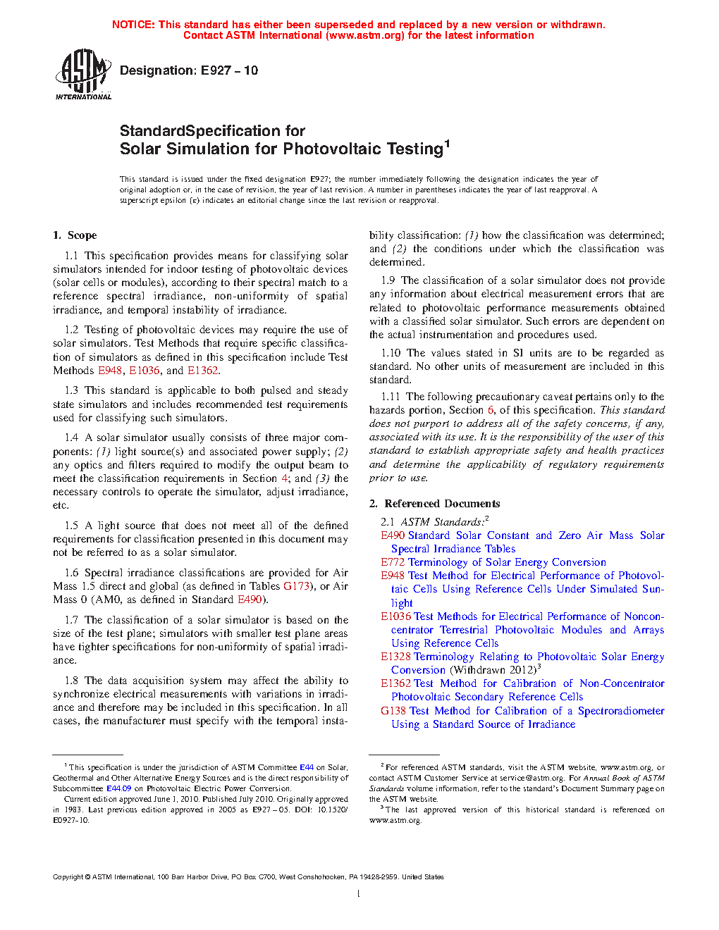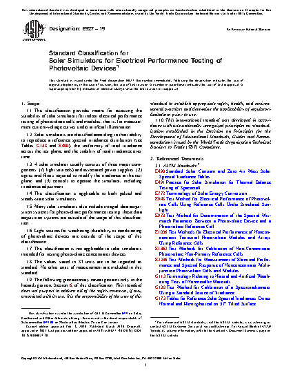 1.1 This classification provides means for assessing the suitability of solar simulators for indoor electrical performance testing of photovoltaic cells and modules, that is, for measurement current-voltage curves under artificial illumination.