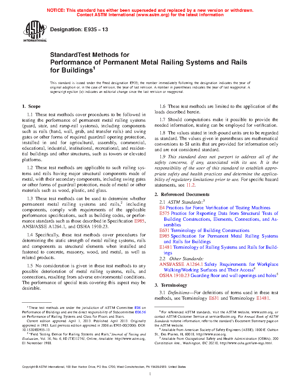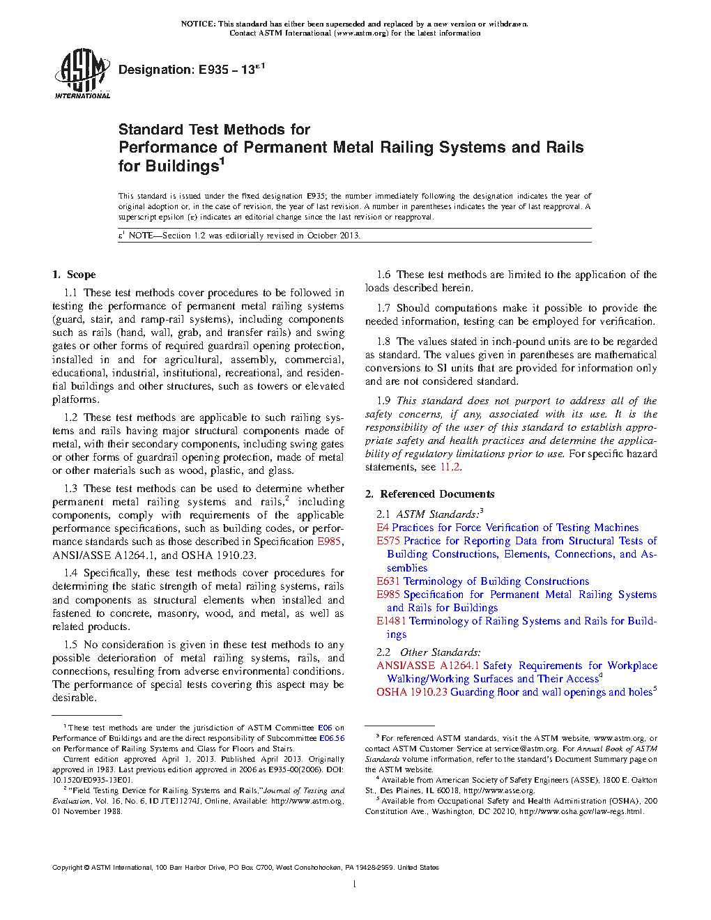 1.3 These test methods can be used to determine whether permanent metal railing systems and rails,2 including components, comply with requirements of the applicable performance specifications, such as building codes, or performance standards such as those described in Specification E985, ANSI/ASSE A1264.1, and OSHA 1910.23.