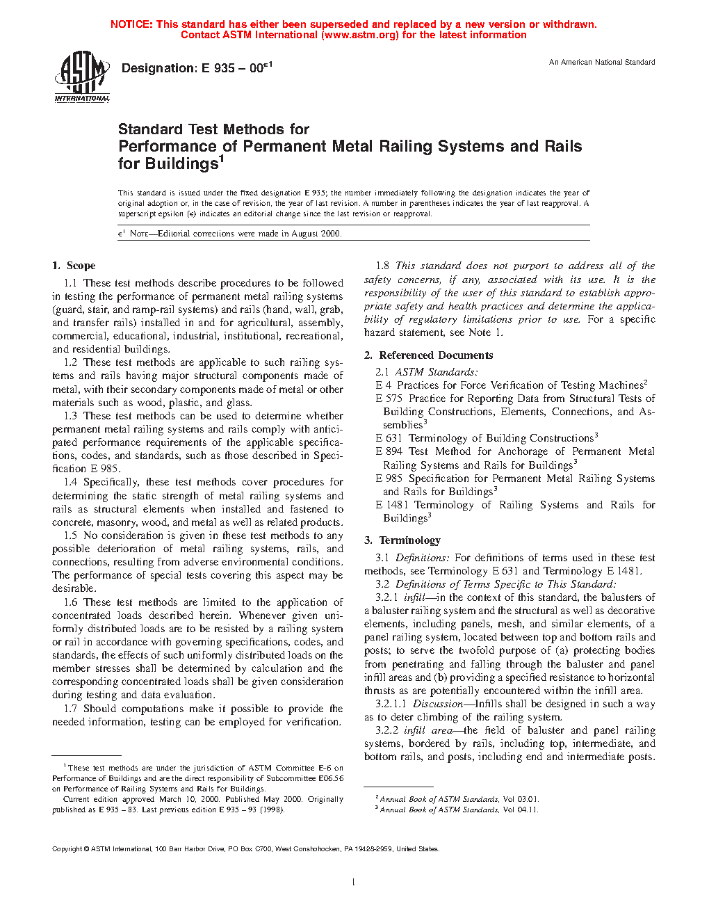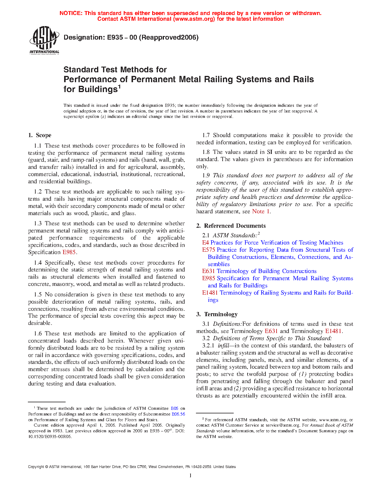 1.5 No consideration is given in these test methods to any possible deterioration of metal railing systems, rails, and connections, resulting from adverse environmental conditions. The performance of special tests covering this aspect may be desirable.