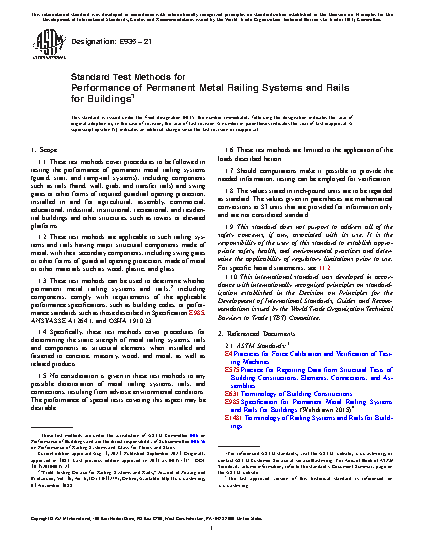 1.1 These test methods cover procedures to be followed in testing the performance of permanent metal railing systems (guard, stair, and ramp-rail systems), including components such as rails (hand, wall, grab, and transfer rails) and swing gates or other forms of required guardrail opening protection, installed in and for agricultural, assembly, commercial, educational, industrial, institutional, recreational, and residential buildings and other structures, such as towers or elevated platforms.