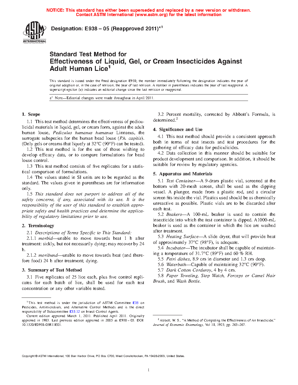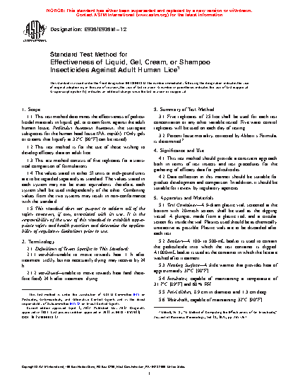 1.1 This test method determines the effectiveness of pediculicidal materials in liquid, gel, or cream form, against the adult human louse, Pediculus humanus humanus, the surrogate subspecies for the human head louse (P.h. capitis). (Only gels or creams that liquefy at 32°C [90°F] can be tested).