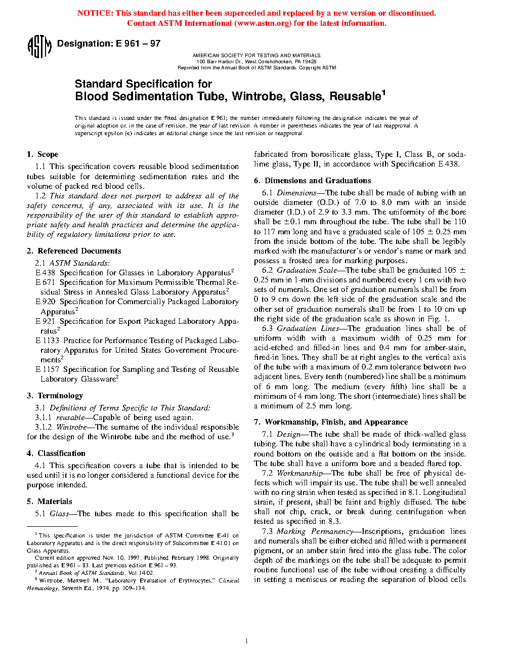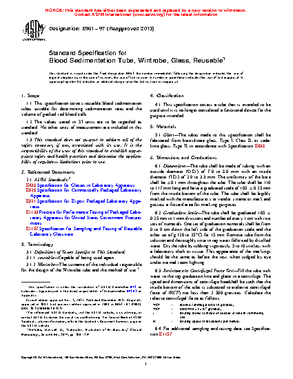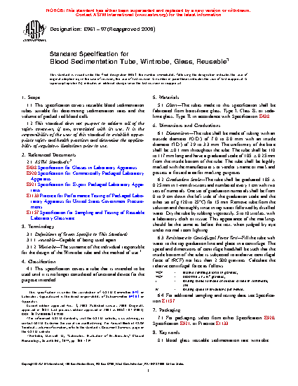 This specification covers reusable blood sedimentation tubes suitable for determining sedimentation rates and the volume of packed red blood cells. The tubes shall be fabricated from borosilicate glass, Type I, Class B, or sodalime glass, Type II. A resistance to centrifugal force test shall be performed on the tubes.