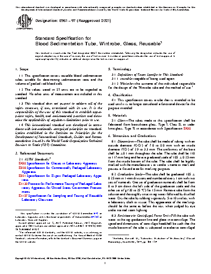 1.1 This specification covers reusable blood sedimentation tubes suitable for determining sedimentation rates and the volume of packed red blood cells.