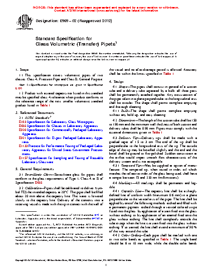 This specification covers volumetric pipets of two classes. Class A, Precision Pipet and Class B, General Purpose. Borosilicate glass for pipets shall conform to the glass requirements specified. Pipets shall be calibrated to deliver the intended capacity. The pipets shall consist in general of a suction tube and a delivery tube separated by a bulb; all three parts shall be permanently attached together. All markings shall be permanent and legible.