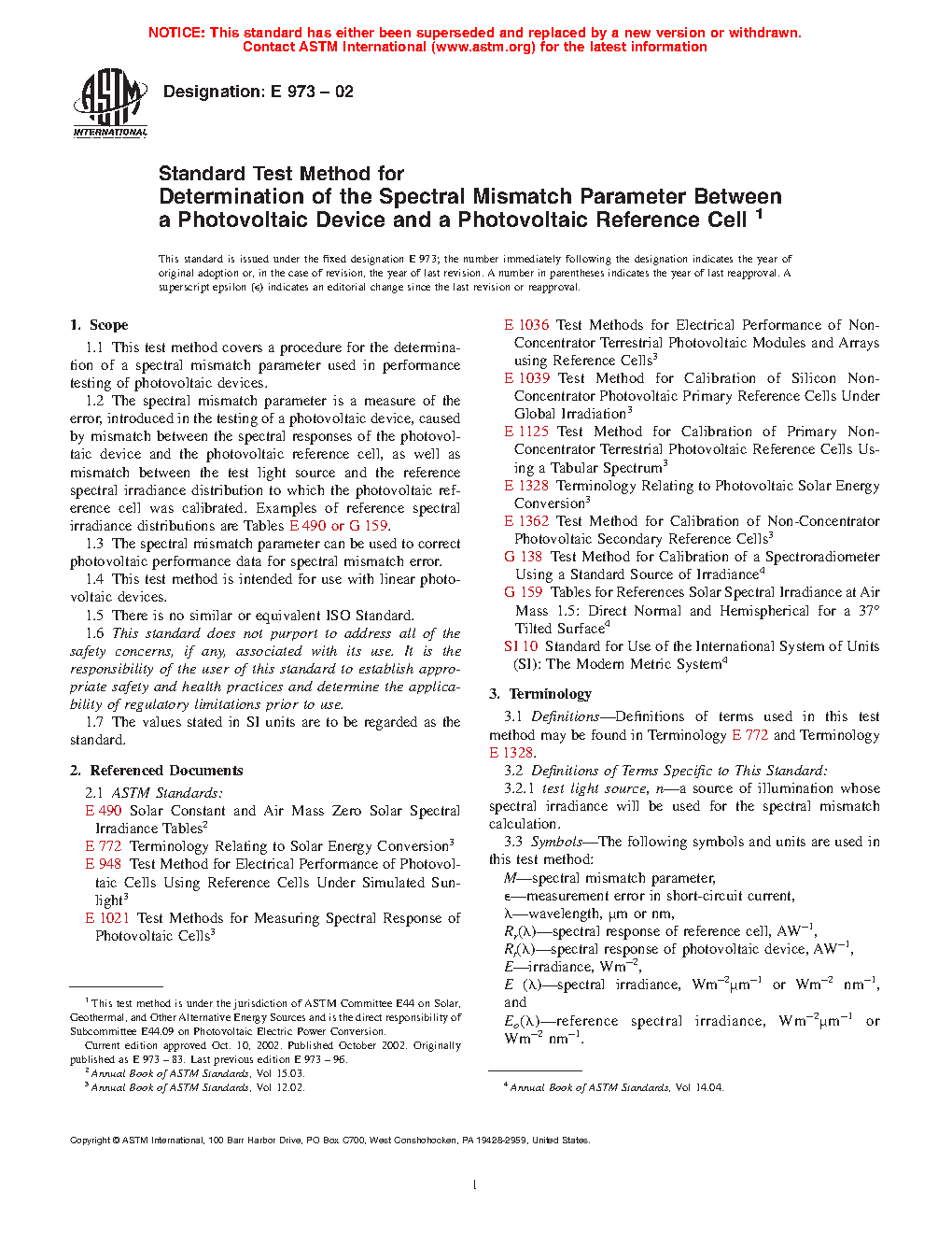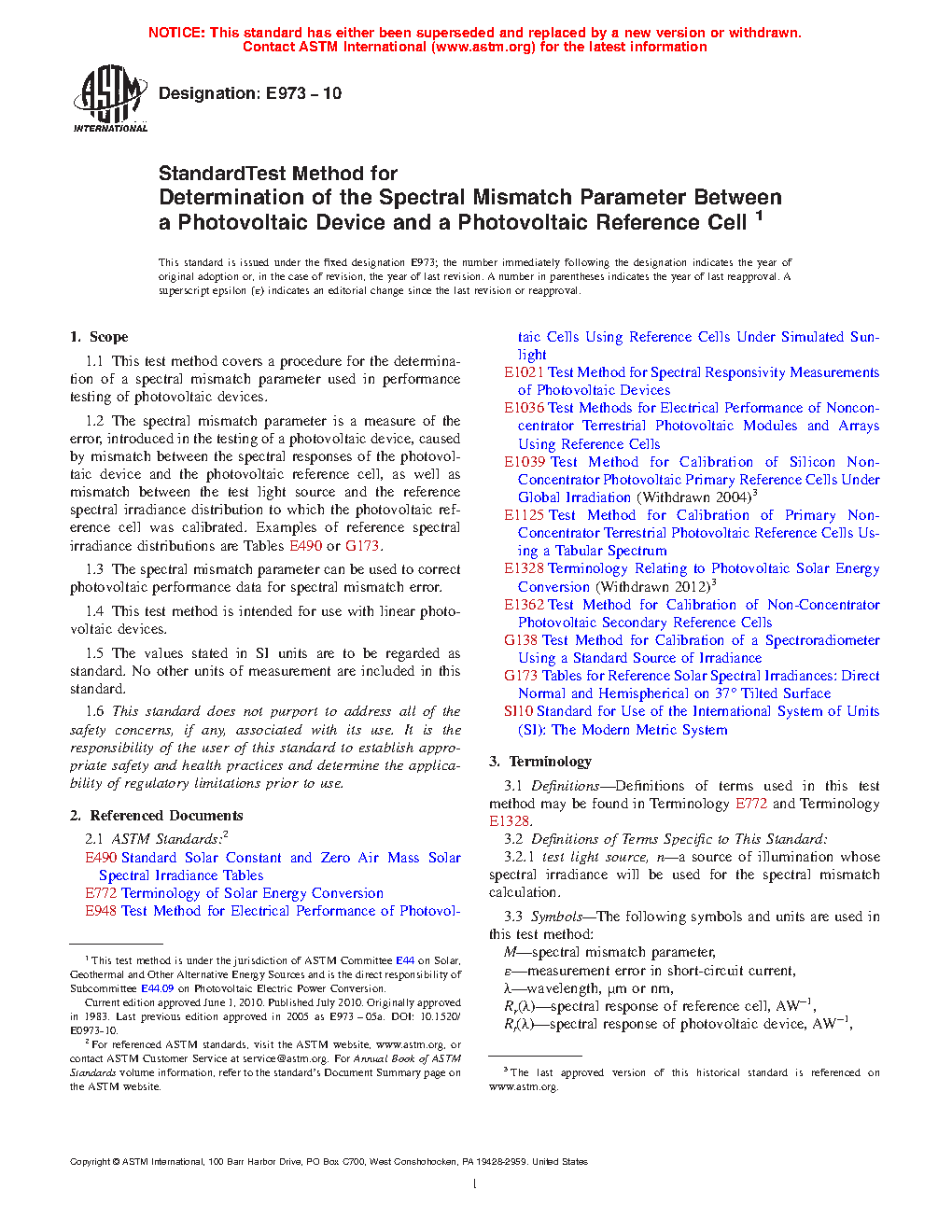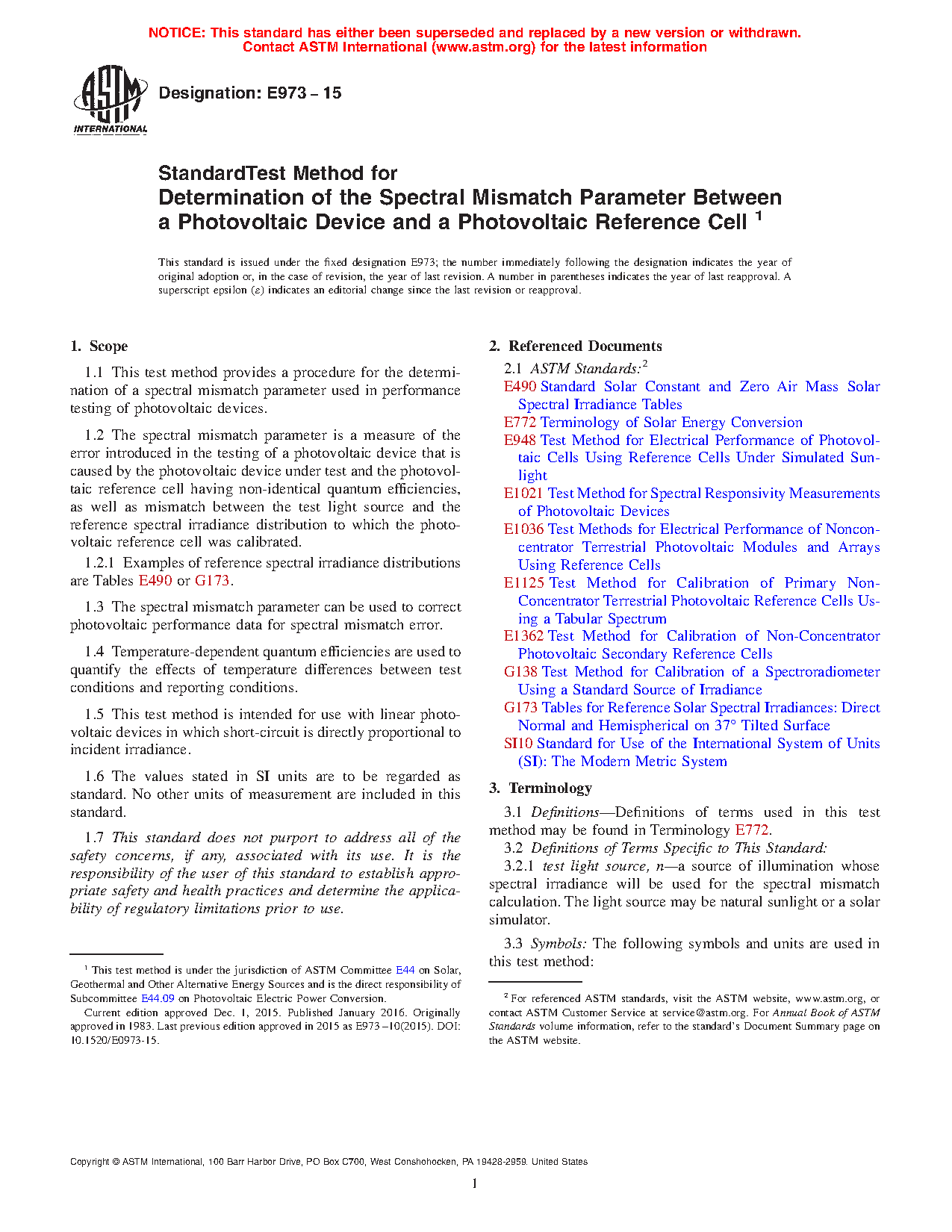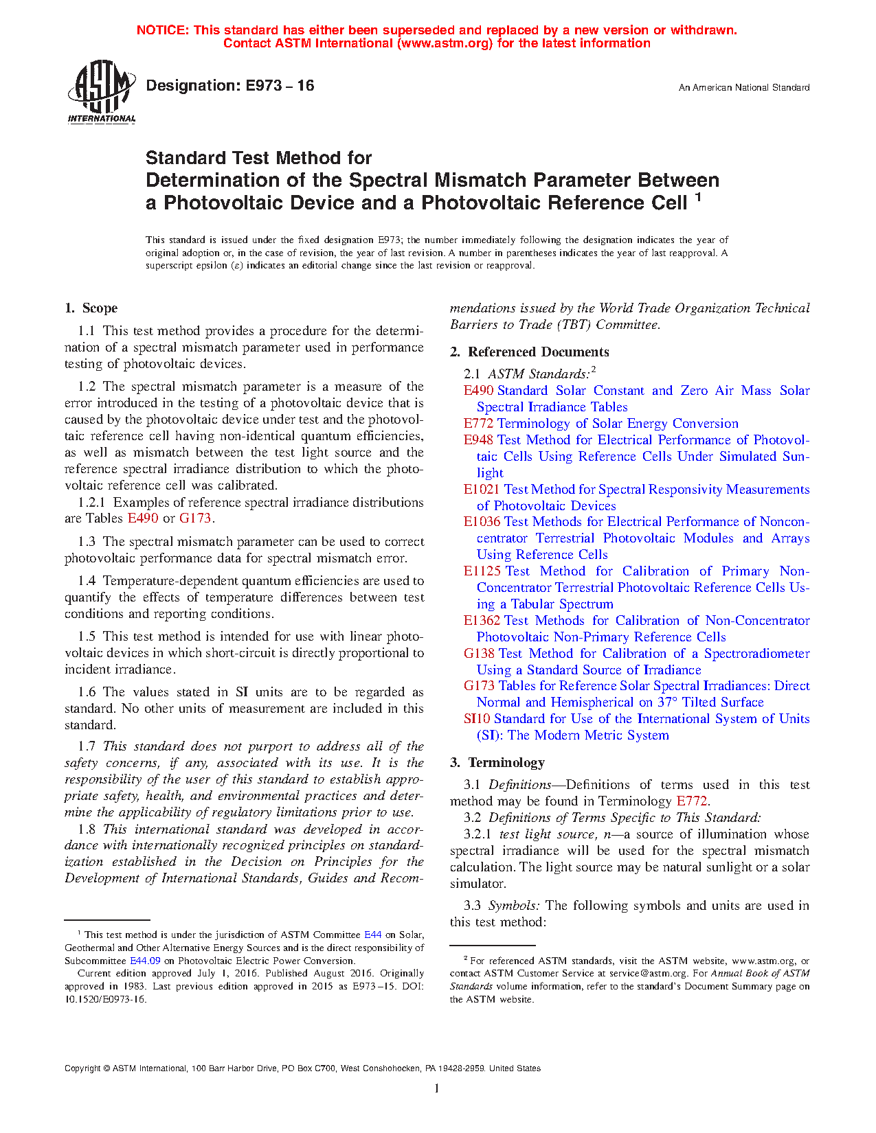 1.2 The spectral mismatch parameter is a measure of the error introduced in the testing of a photovoltaic device that is caused by the photovoltaic device under test and the photovoltaic reference cell having non-identical quantum efficiencies, as well as mismatch between the test light source and the reference spectral irradiance distribution to which the photovoltaic reference cell was calibrated.