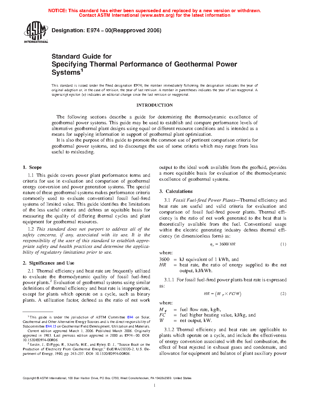1.1 This guide covers power plant performance terms and criteria for use in evaluation and comparison of geothermal energy conversion and power generation systems. The special nature of these geothermal systems makes performance criteria commonly used to evaluate conventional fossil fuel-fired systems of limited value. This guide identifies the limitations of the less useful criteria and defines an equitable basis for measuring the quality of differing thermal cycles and plant equipment for geothermal resources.