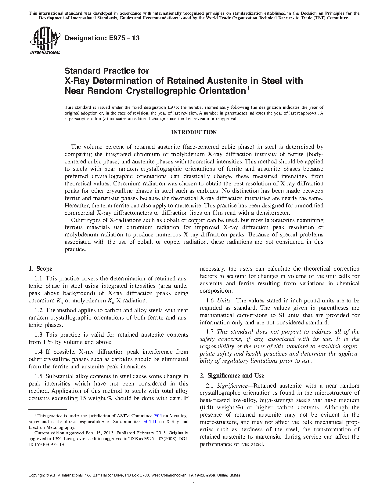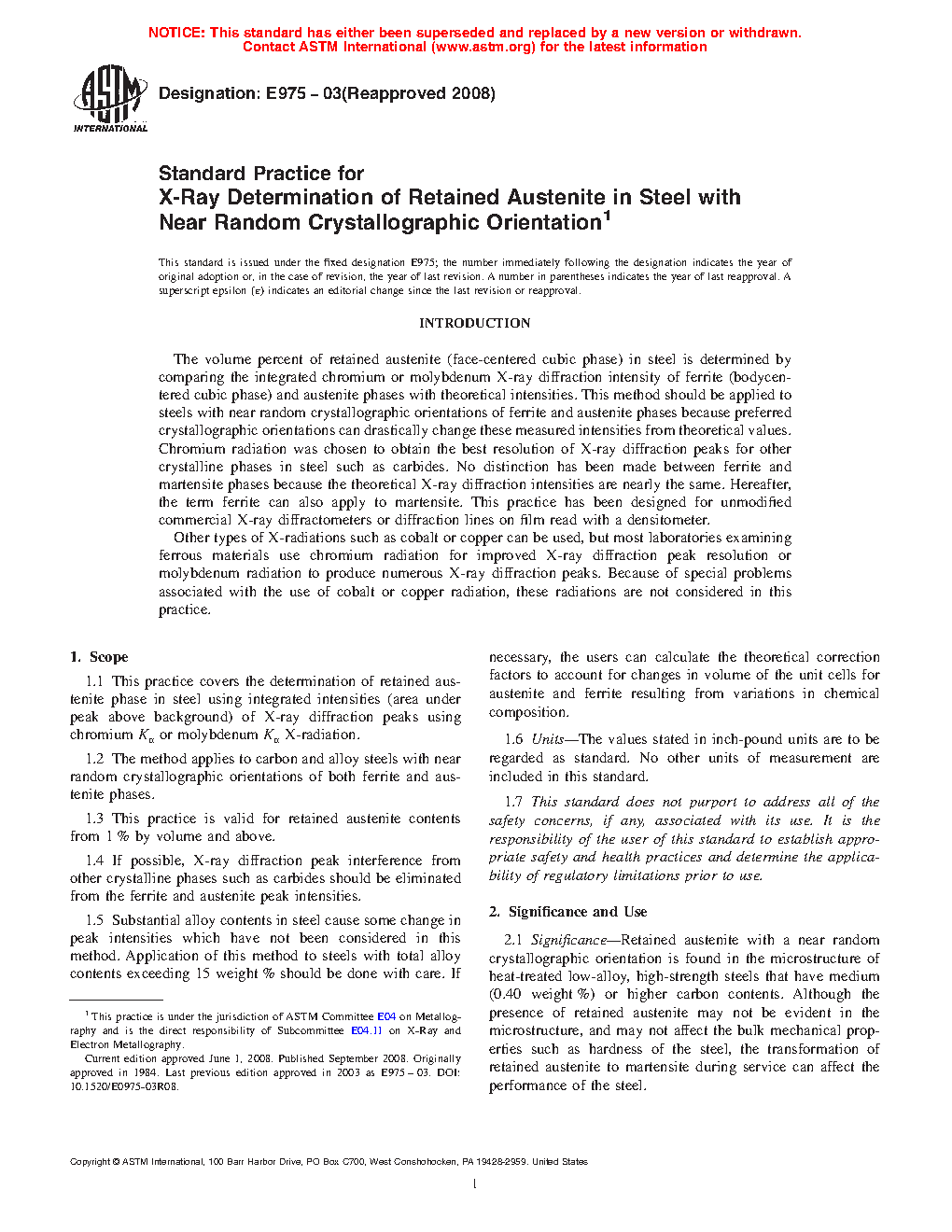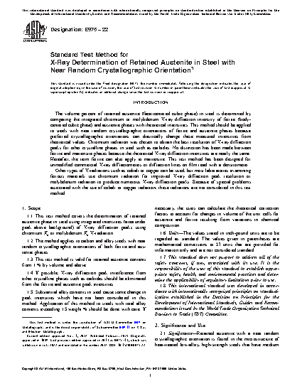 1.1 This practice covers the determination of retained austenite phase in steel using integrated intensities (area under peak above background) of X-ray diffraction peaks using chromium Kα or molybdenum Kα X-radiation.