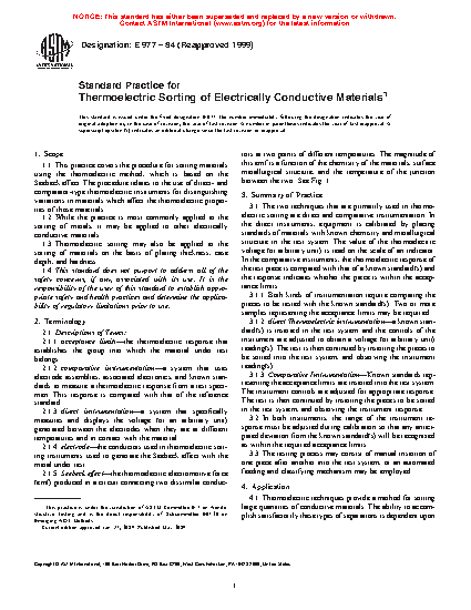 1.1 This practice covers the procedure for sorting materials using the thermoelectric method, which is based on the Seebeck effect. The procedure relates to the use of direct- and comparator-type thermoelectric instruments for distinguishing variations in materials which affect the thermoelectric properties of those materials.