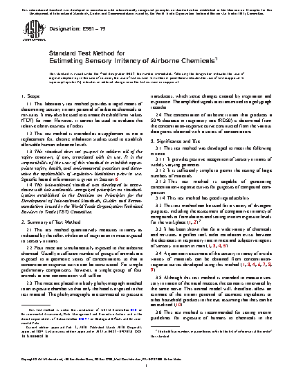 1.1 This laboratory test method provides a rapid means of determining sensory irritant potential of airborne chemicals or mixtures. It may also be used to estimate threshold limit values (TLV) for man. However, it cannot be used to evaluate the relative obnoxiousness of odors.