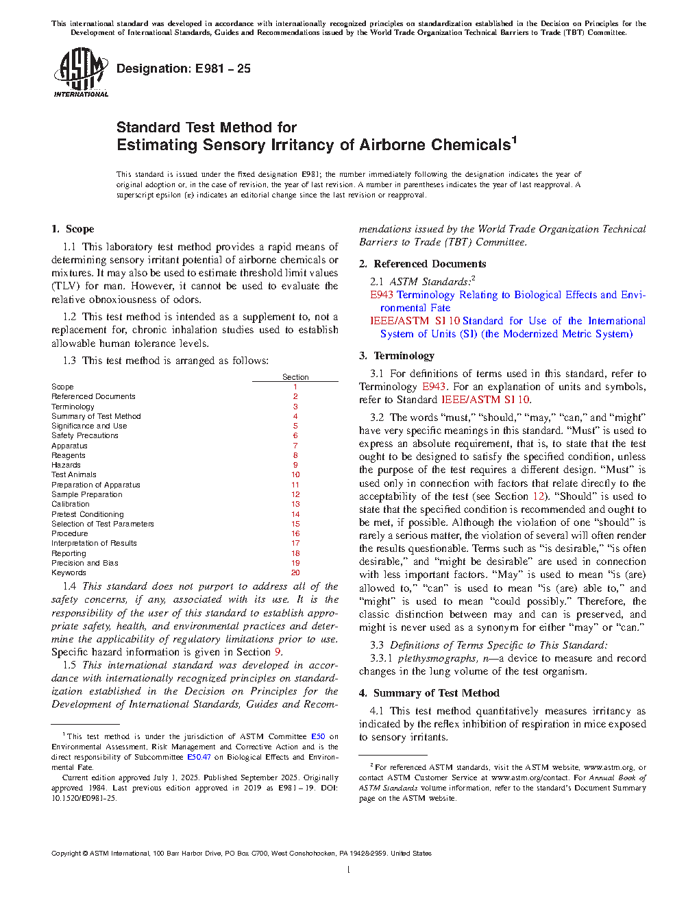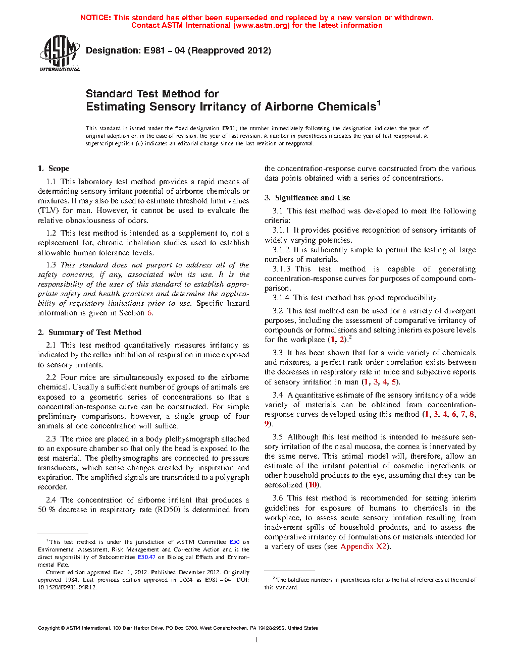 3.6 This test method is recommended for setting interim guidelines for exposure of humans to chemicals in the workplace, to assess acute sensory irritation resulting from inadvertent spills of household products, and to assess the comparative irritancy of formulations or materials intended for a variety of uses (see Appendix X2).