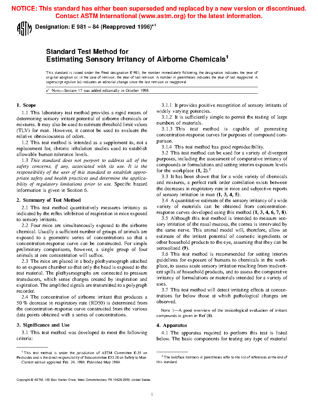 3.2 This test method can be used for a variety of divergent purposes, including the assessment of comparative irritancy of compounds or formulations and setting interim exposure levels for the workplace (1, 2).2