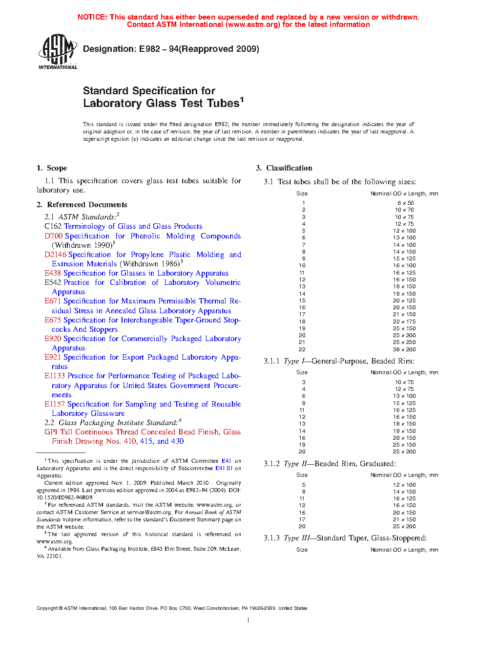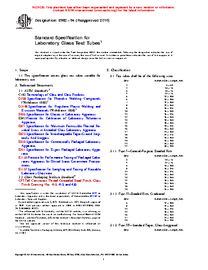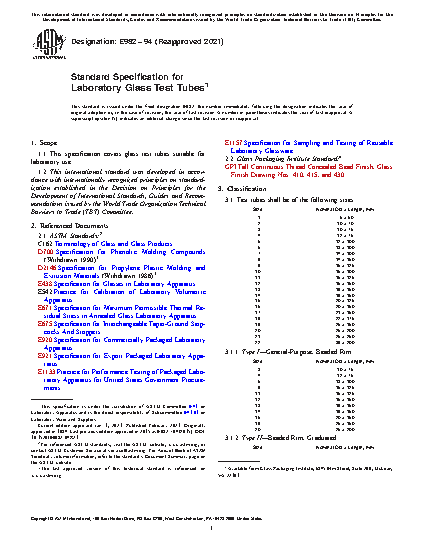 This specification covers glass test tubes suitable for laboratory use. The test tubes shall be of the following classification according to size: Type I, Type II, Type III, Type IV (Class A, Class B, and Class C), Type V, Type VI, and Type VII. Test tubes shall be made of the prescribed borosilicate glass (Type I glass) or of soda-lime glass (Type II glass) and shall be tubular, with one end having a rounded closure. The following are specified: (1) material requirements for screw caps, liners, and annealing and (2) design requirements for the test tube capacity, dimensions (OD, length, and wall thickness), and area for marking. Other dimensional requirements such as subdivision, stopper, and GPI thread finish are also specified.