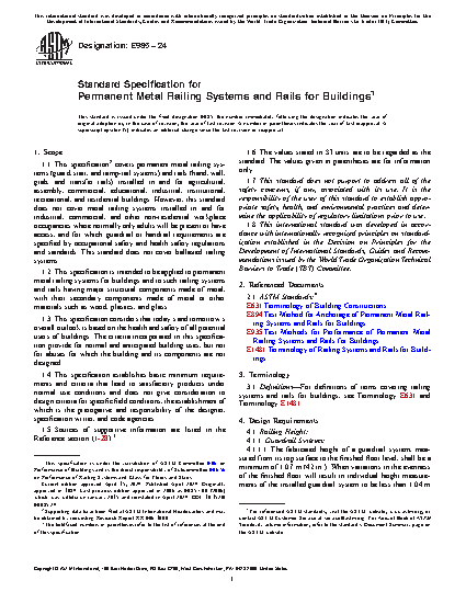 1.1 This specification covers permanent metal railing systems (guard, stair, and ramp-rail systems) and rails (hand, wall, grab, and transfer rails) installed in and for agricultural, assembly, commercial, educational, industrial, institutional, recreational, and residential buildings.