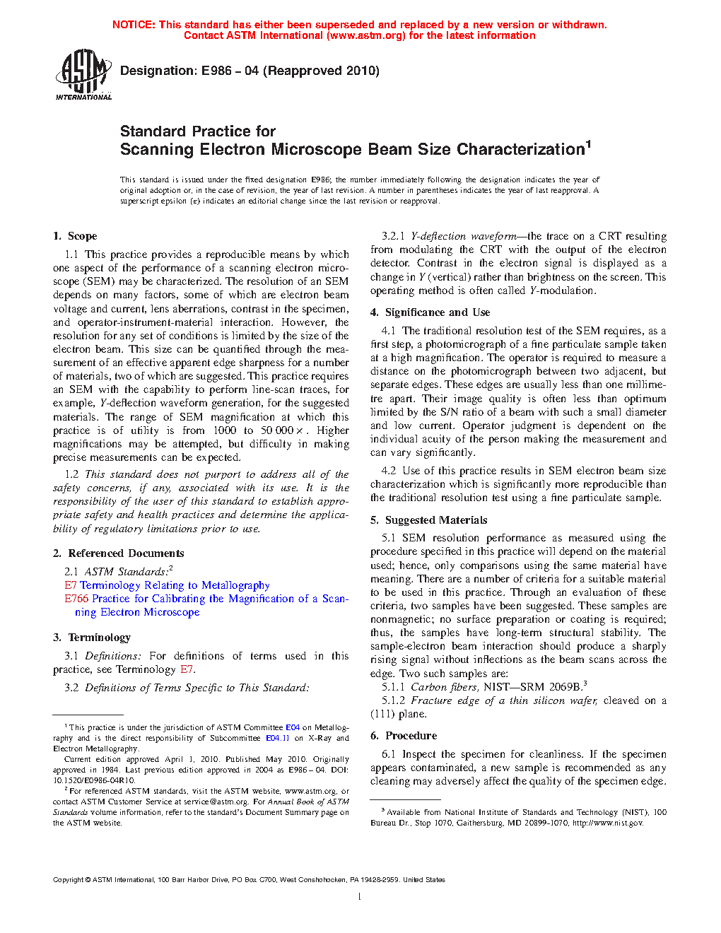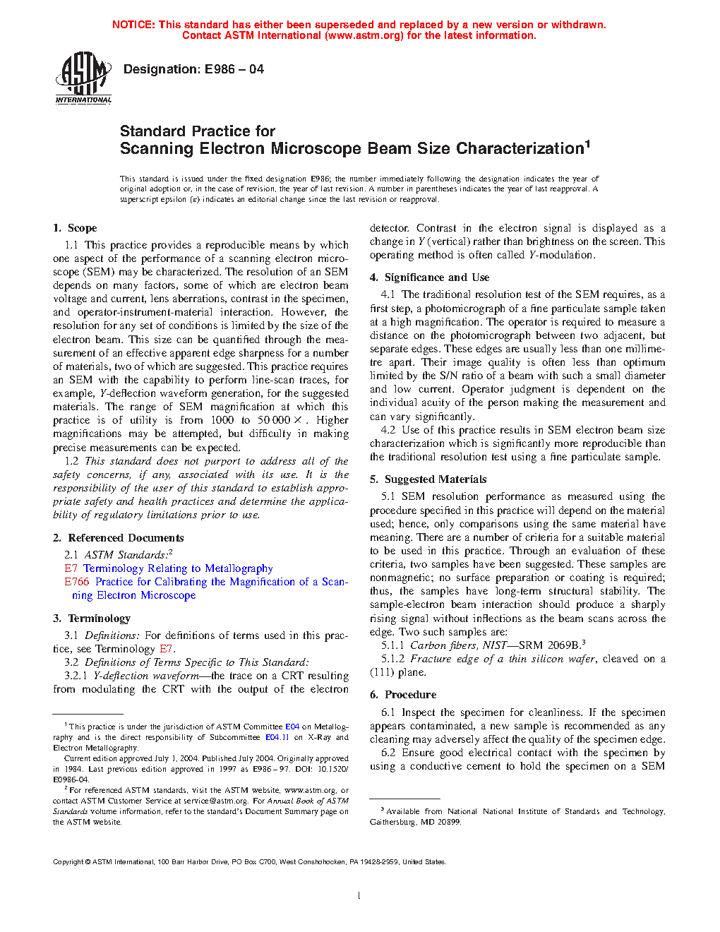 Use of this practice results in SEM electron beam size characterization which is significantly more reproducible than the traditional resolution test using a fine particulate sample.