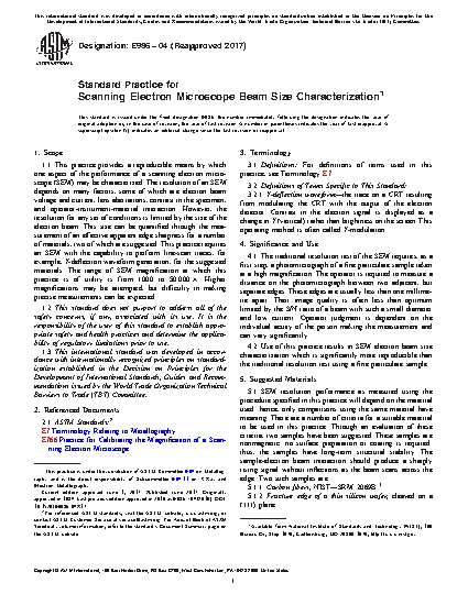 1.1 This practice provides a reproducible means by which one aspect of the performance of a scanning electron microscope (SEM) may be characterized. The resolution of an SEM depends on many factors, some of which are electron beam voltage and current, lens aberrations, contrast in the specimen, and operator-instrument-material interaction. However, the resolution for any set of conditions is limited by the size of the electron beam. This size can be quantified through the measurement of an effective apparent edge sharpness for a number of materials, two of which are suggested. This practice requires an SEM with the capability to perform line-scan traces, for example, Y-deflection waveform generation, for the suggested materials. The range of SEM magnification at which this practice is of utility is from 1000 to 50 000 x. Higher magnifications may be attempted, but difficulty in making precise measurements can be expected.