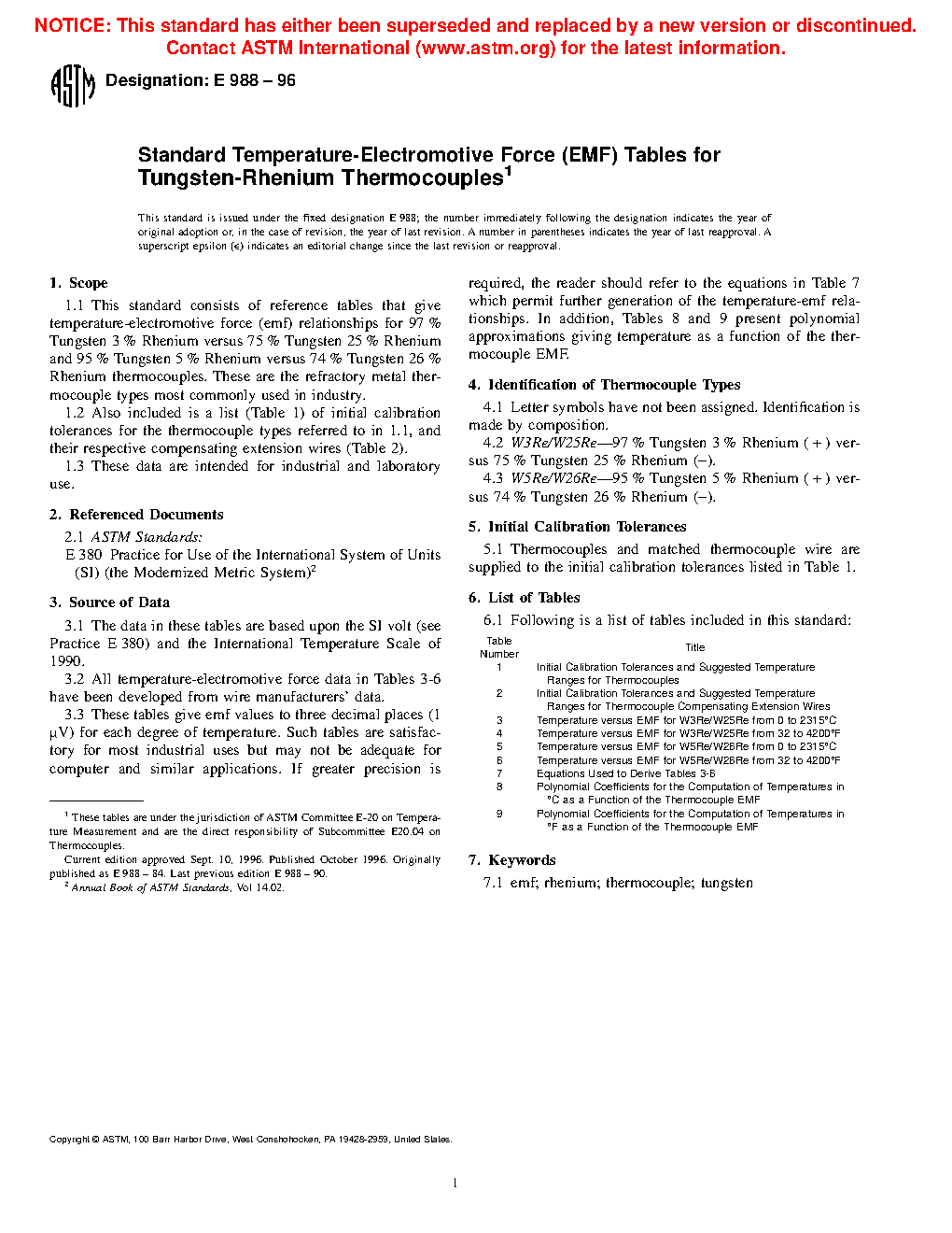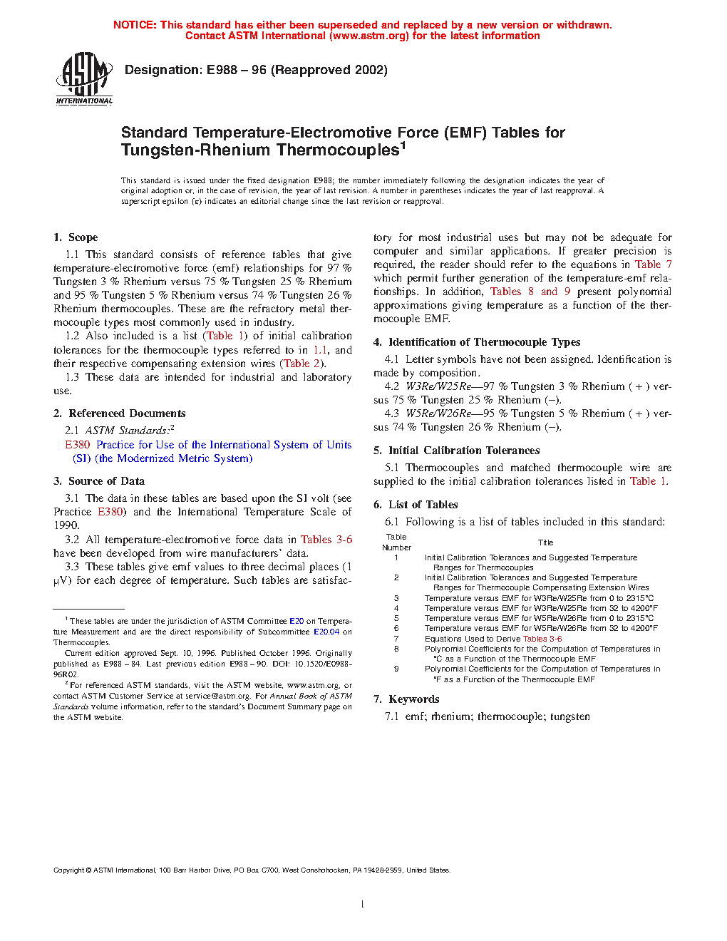1.1 This standard consists of reference tables that give temperature-electromotive force (emf) relationships for 97% Tungsten 3% Rhenium versus 75% Tungsten 25% Rhenium and 95% Tungsten 5% Rhenium versus 74% Tungsten 26% Rhenium thermocouples. These are the refractory metal thermocouple types most commonly used in industry.