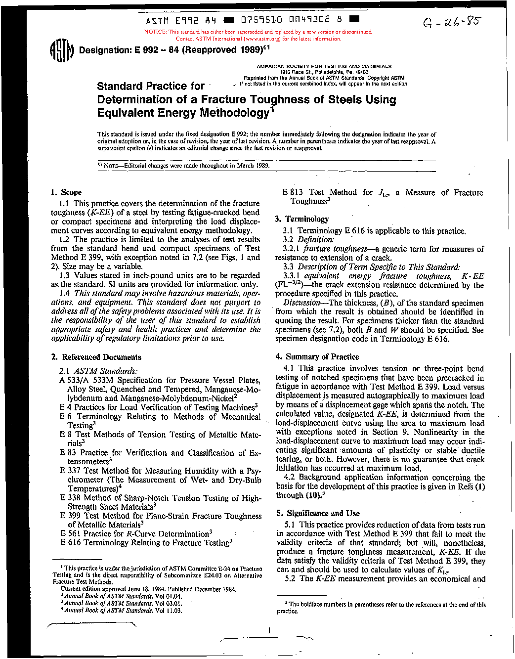 1.1 This practice covers the determination of the fracture toughness ( K-EE ) of a steel by testing fatigue-cracked bend or compact specimens and interpreting the load displacement curves according to equivalent energy methodology.